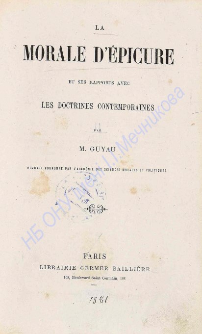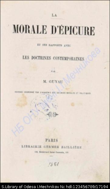 Бібліографічний опис: | Guyau, Jean-Marie (1854-1888). Le morale d’Epicure et ses rapports avec les doctrines contemporaines / par M. Guyau … - Paris : Librairie Germer Bailliere ; typ. et stereotyp. V.-Eugene, [1878]. – 290, [2] p. |