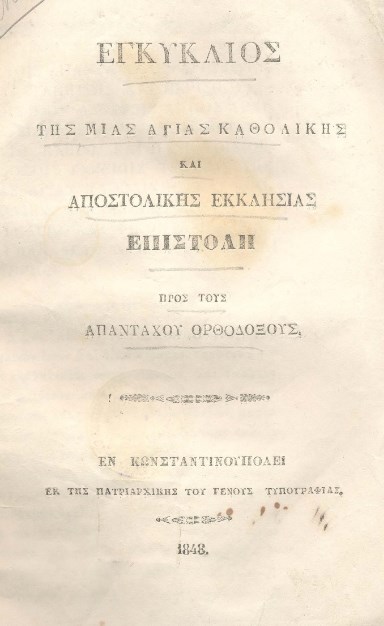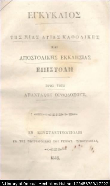 Бібліографічний опис: Εγκύκλιος της μίας Αγίας Καθολικής και Αποστολικής Εκκλησίας : επιστολή προς τους απανταχού Ορθοδόξου. - Κωνσταντινούπολη [İstanbul] : εκ της Πατριαρχικής του Γένους Τυπογραφίας, 1848. – [2], 48, 2 σ.