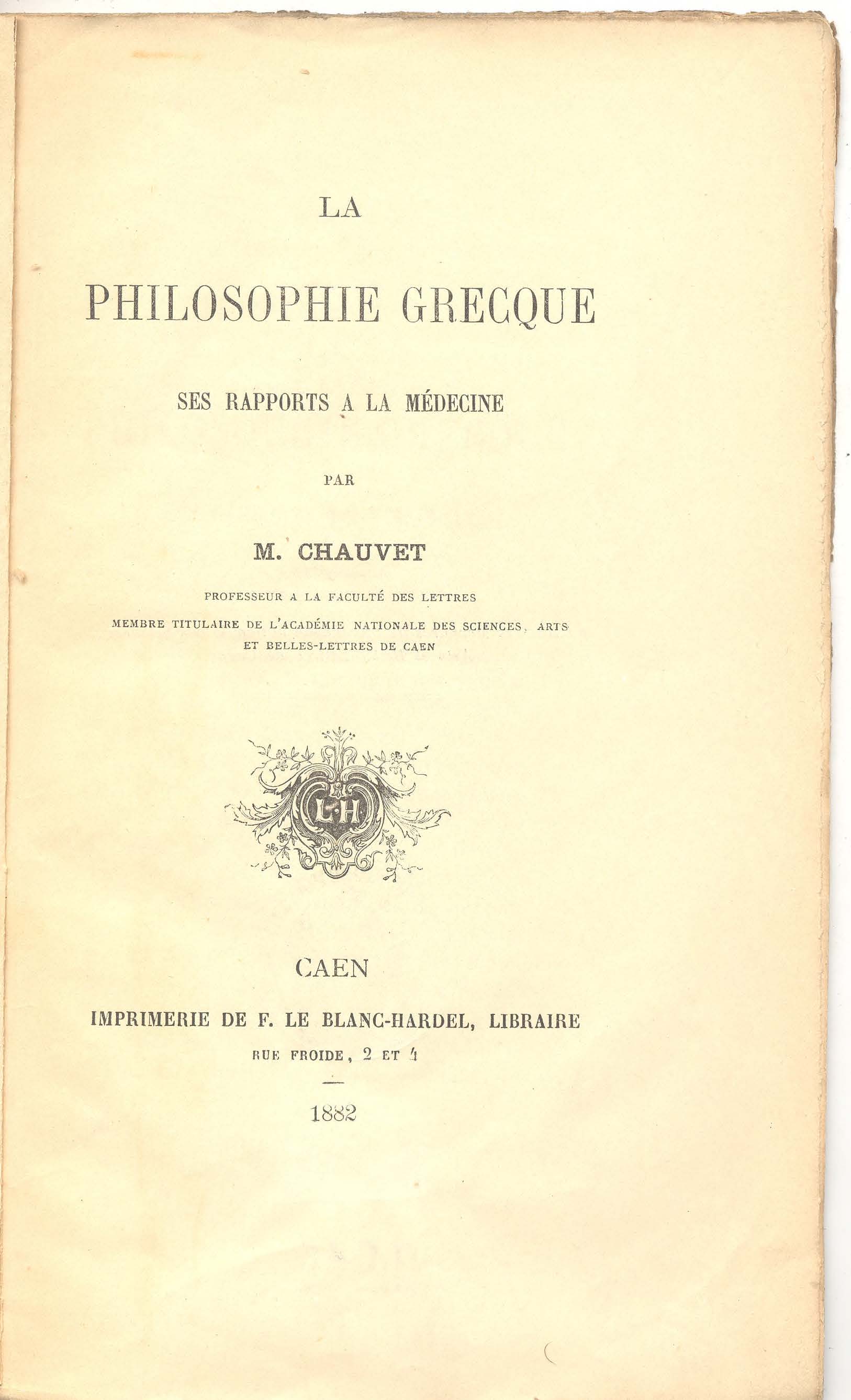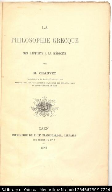 Бібліографічний опис: | Chauvet, Emmanuel (1819-1910). La philosophie grecque ses rapports a la médecine / par m. Chauvet … - Caen : impr. de F. Le Blanc-Hardel, libraire, 1882. – [2], 28, [2] p. |