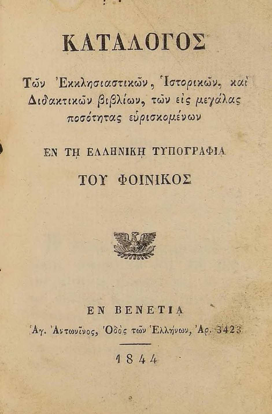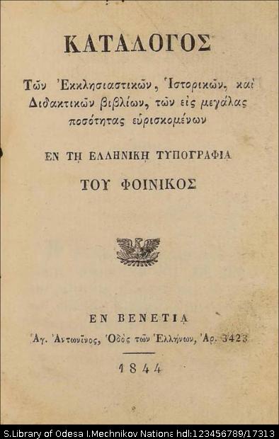 Бібліографічний опис: | Κατάλογος των εκκλησιαστικών, ιστορικών, καί διδακτικών βιβλίων, των είς μεγάλας ποσότητας ευρισκομένων. – Eν Bένετια [Venezia] : εν τη ελληνική τυπογραφία του Φοίνικος, 1844. – 30, [2] σ. |