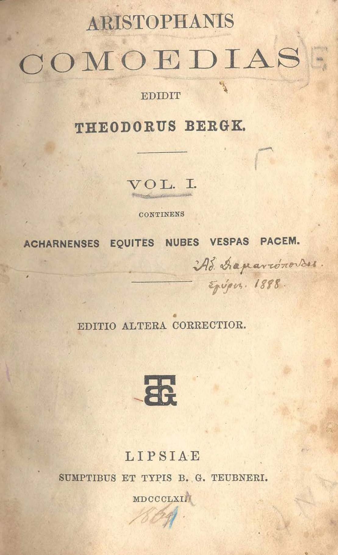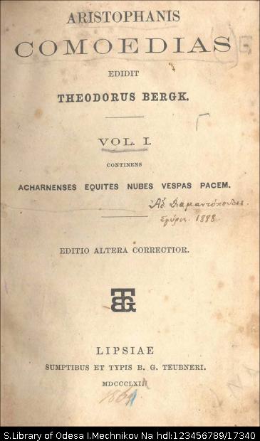 Бібліографічний опис: | Aristophanus (Ἀριστοφάνης ; ca 450 – ca 385 a. ae. n.). Aristophanis comoedias: [in 2 vol.] / edidit Theodorus Bergk. – Ed. altera correctior. – Lipsiae [Leipzig] : sumptibus et typis B. G. Teubneri, 1862-1867. Vol. 1 : Continens Acharnenses, Equites, Nubes, Vespas, Pacem. – 1862. – XLVII, [2], 287, [1] p. |