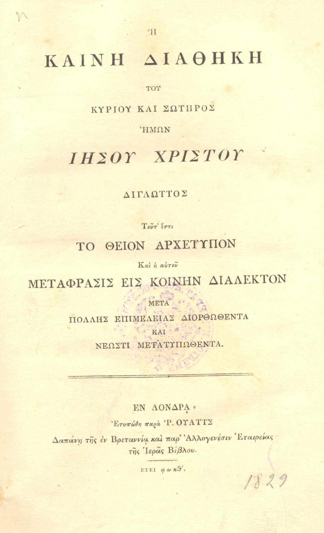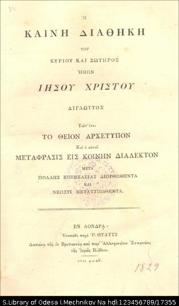 Бібліографічний опис: | Η Καινή Διαθήκη του Κυρίου και Σωτήρος ημών Ιησού Χριστού : δίγλωττος, : τούτ' έστι, το Θείον Αρχέτυπον και η αυτού μετάφρασις εις κοινήν διάλεκτον'. – Μετά πολλής επιμελείας διορθωθέντα, και νεωστί μετατυπωθέντα. – Εν Λόνδρα [London] : Εξετυπώθη παρά Ῥ. Ουαττσ δαπάνη της εν Βρεταννία και παρ' Αλλογενέσιν Εταιρείας της Ιεράς Βίβλου, 1829. – [6], 722 σ. |