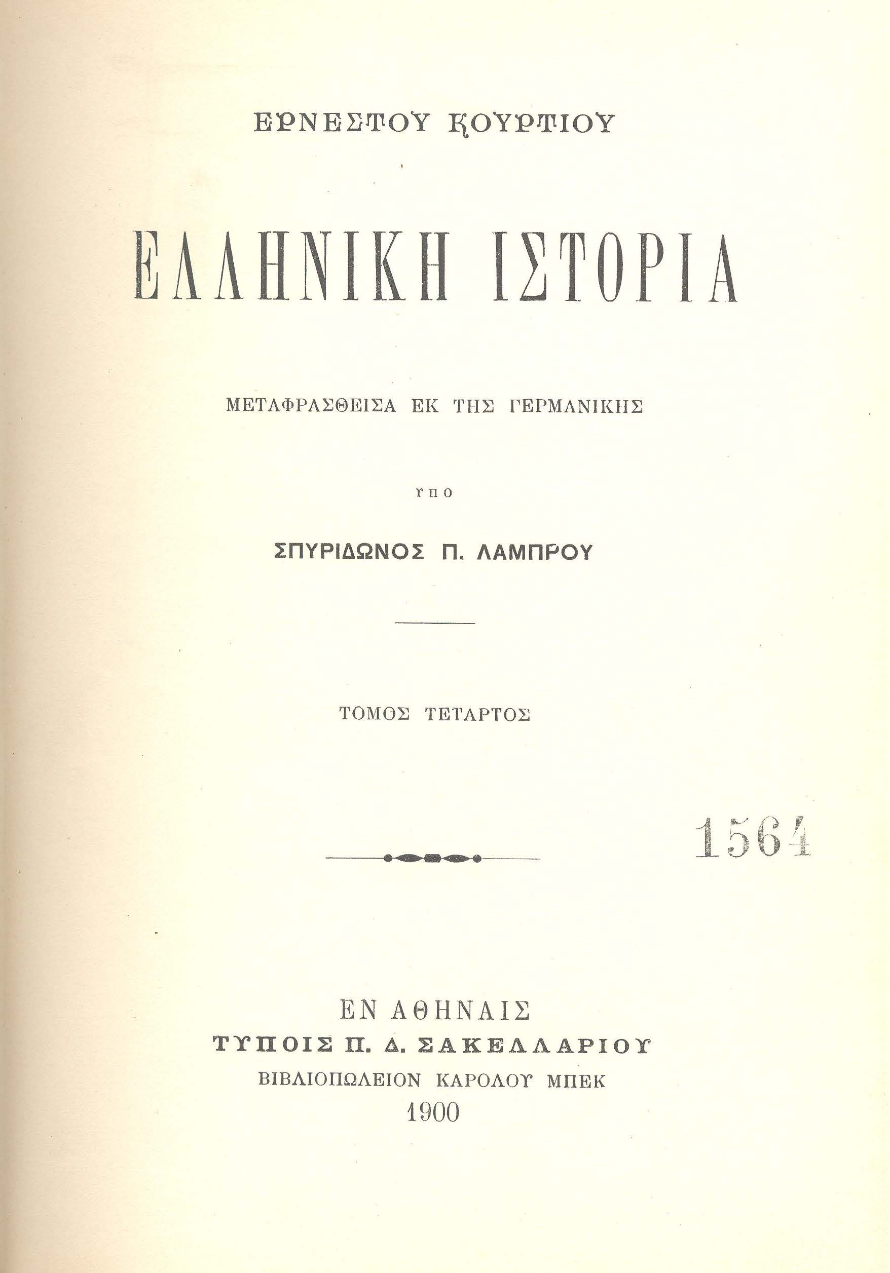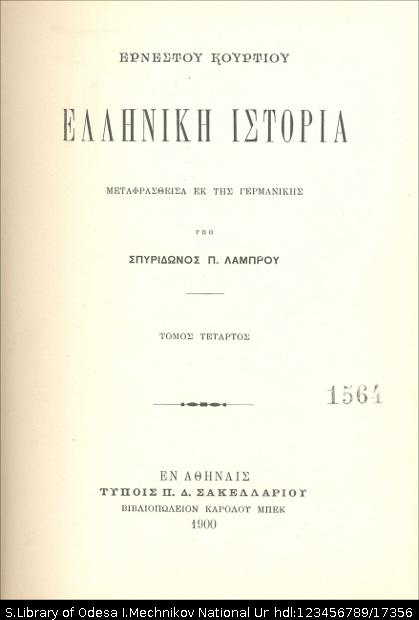 Бібліографічний опис: | Κουρτιου, Ερνεστου (Curtius, Ernst ; 1814-1896). Ελληνικη ιστορια : [σε 5 τ.] / Ερνέστου Κουρτίου ; μεταφρασθεισα εκ τησ γερμανικησ υπο Σπυριδωνοσ Π. Λαμπρου. – Αφηναισ : Τυπ. Π. Δ. Σακελλαριου, 1898-1900. – (Βιβλιοθηκη Μαρασλη. Συλλογη εκκριτηων επιστημονικων χενων τε εν Ελληνικη, μεταφρασει και πρωτοτυπων συγγραμματων). Τ. 4. – 1900. – [4], 617, [1] σ. |