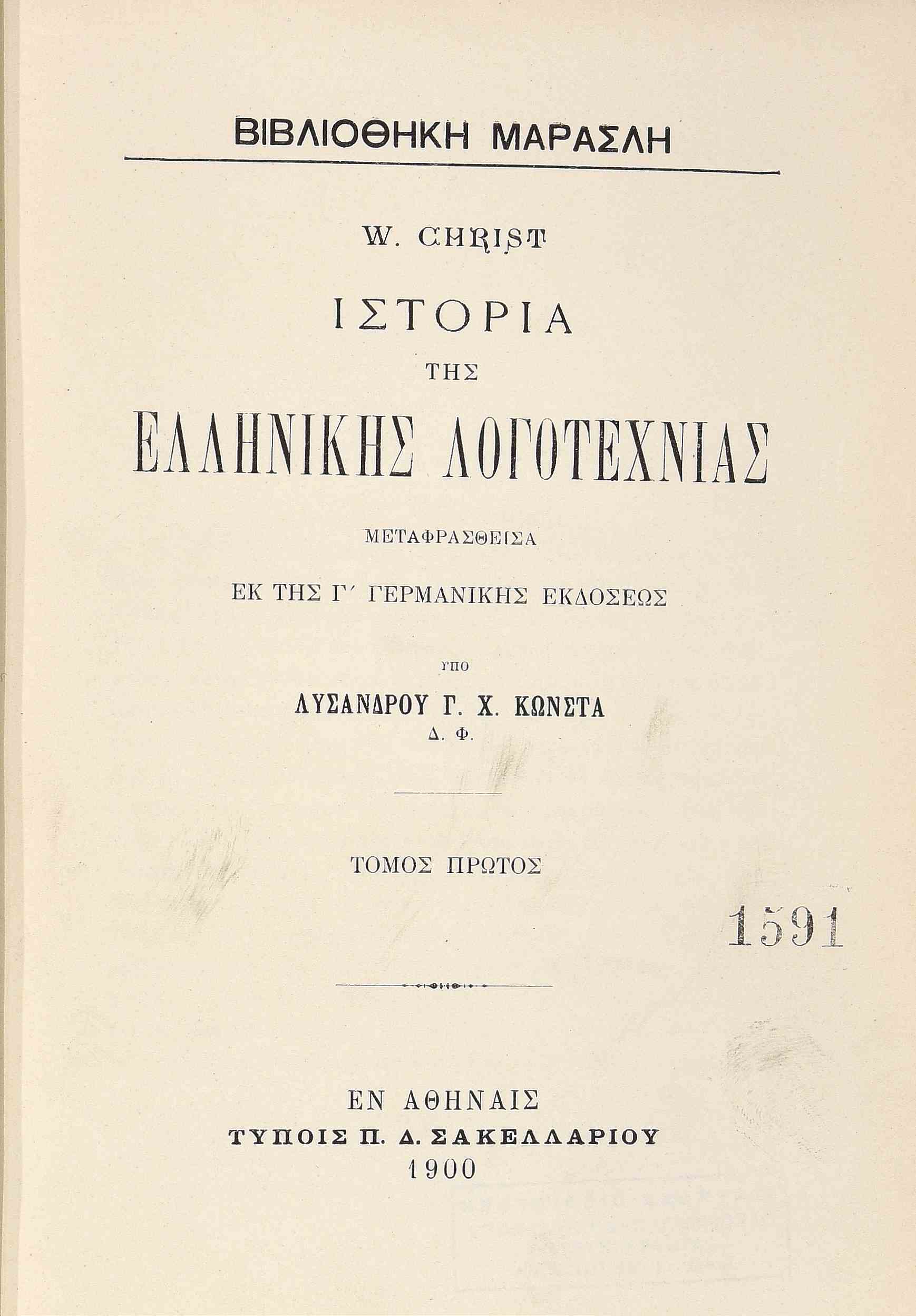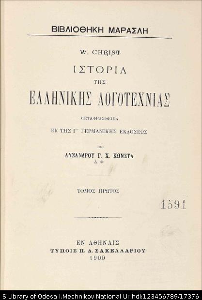 Бібліографічний опис: | Christ, Wilhelm von (1831-1906). Ιστορια τησ ελληνικησ λογοτεχνιασ / μεταφρασθείσα εκ της Γ΄ γερμανικησ εκδοσωσ υπο Λυσανδρου Γ. Χ. Κωνστα Δ. Φ. - Αφηναισ : Τυπ. Π. Δ. Σακελλαριου, 1900. – (Βιβλιοθηκη Μαρασλη. Συλλογη εκκριτηων επιστημονικων χενων τε εν Ελληνικη, μεταφρασει και πρωτοτυπων συγγραμματων). Τ. 1. – 1900. – [4], 928 σ. |