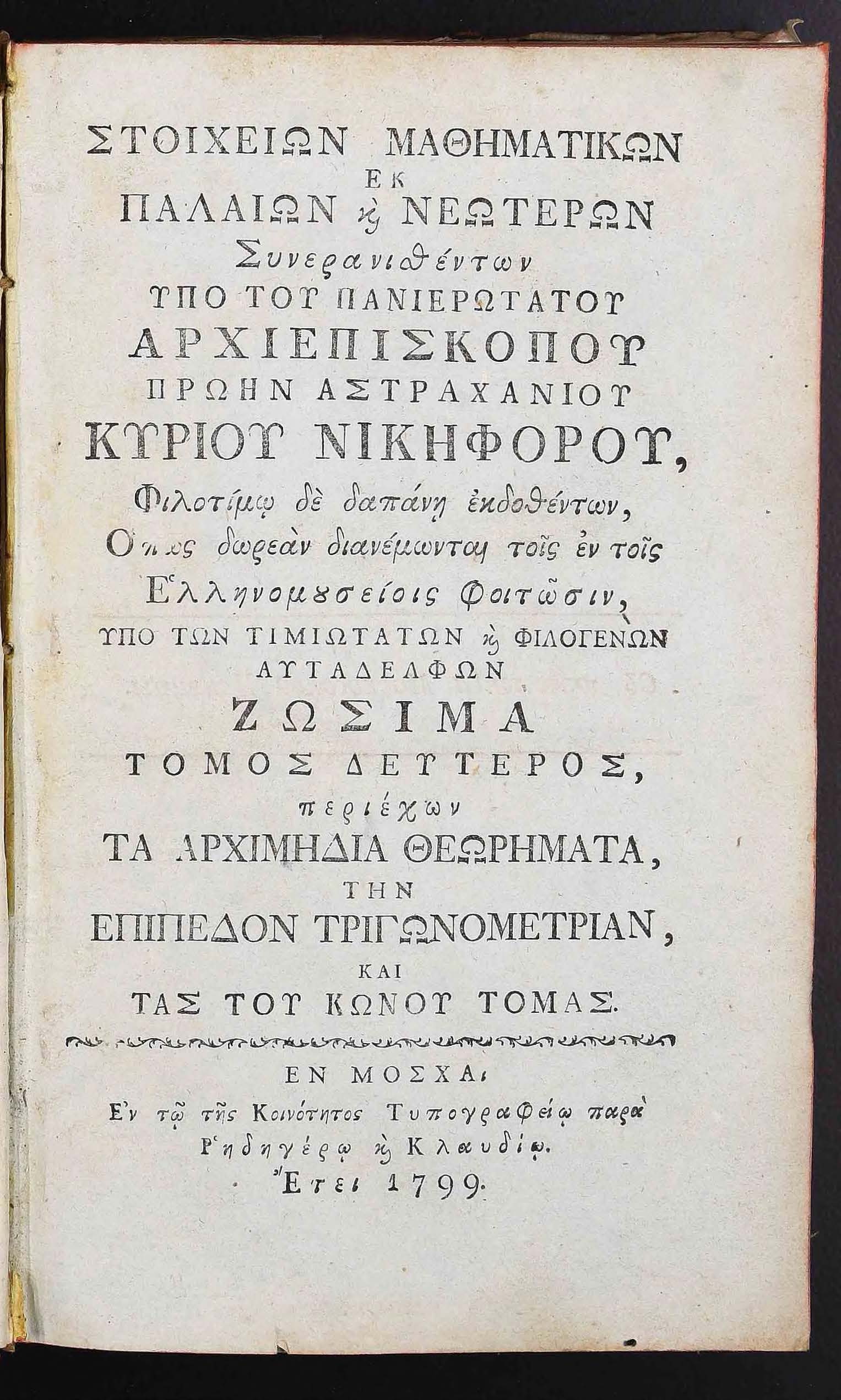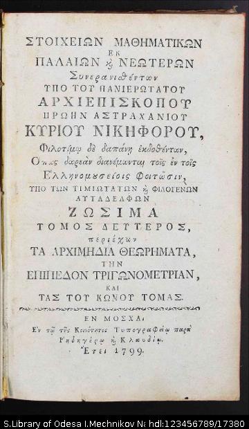 Бібліографічний опис: | Νικηφόρος (Θεοτόκης, Νικόλαος ; αρχιεπίσκοπος Νικηφόρος ; 1731–1800). Στοιχείων Μαθηματικών εκ παλαιών κς νεωτέρων : [εν 3 τ.] / συνερανισθέντων υπό του πανιερωτάτου Αρχιεπισκόπου πρώην Αστραχανίου κυρίου Νικηφόρου, φιλοτίμω δε δαπάνη εκδοθέντων, όπως δωρεάν διανέμωνται τοις εν τοις Ελληνομουσείοις Φοιτώσιν, υπό των τιμιωτάτων και φιλογενών αυταδέλφων Ζωσιμά. – Εν Μόσχα : εν τω της Κοινότητος Τυπογραφείω παρά Ρηδηγέρω και Κλαυδίω., 1798-1799 . Т. 2 : … περιέχων τα Αρχιμήδια Θεωρήματα την Επίπεδον Τριγωνομετρίαν, και τας του Κώνου Τομάς. – 1799. – 246 ς., 30 πίν. ; 8⁰ (20,5х12,5х2 εκ). |
