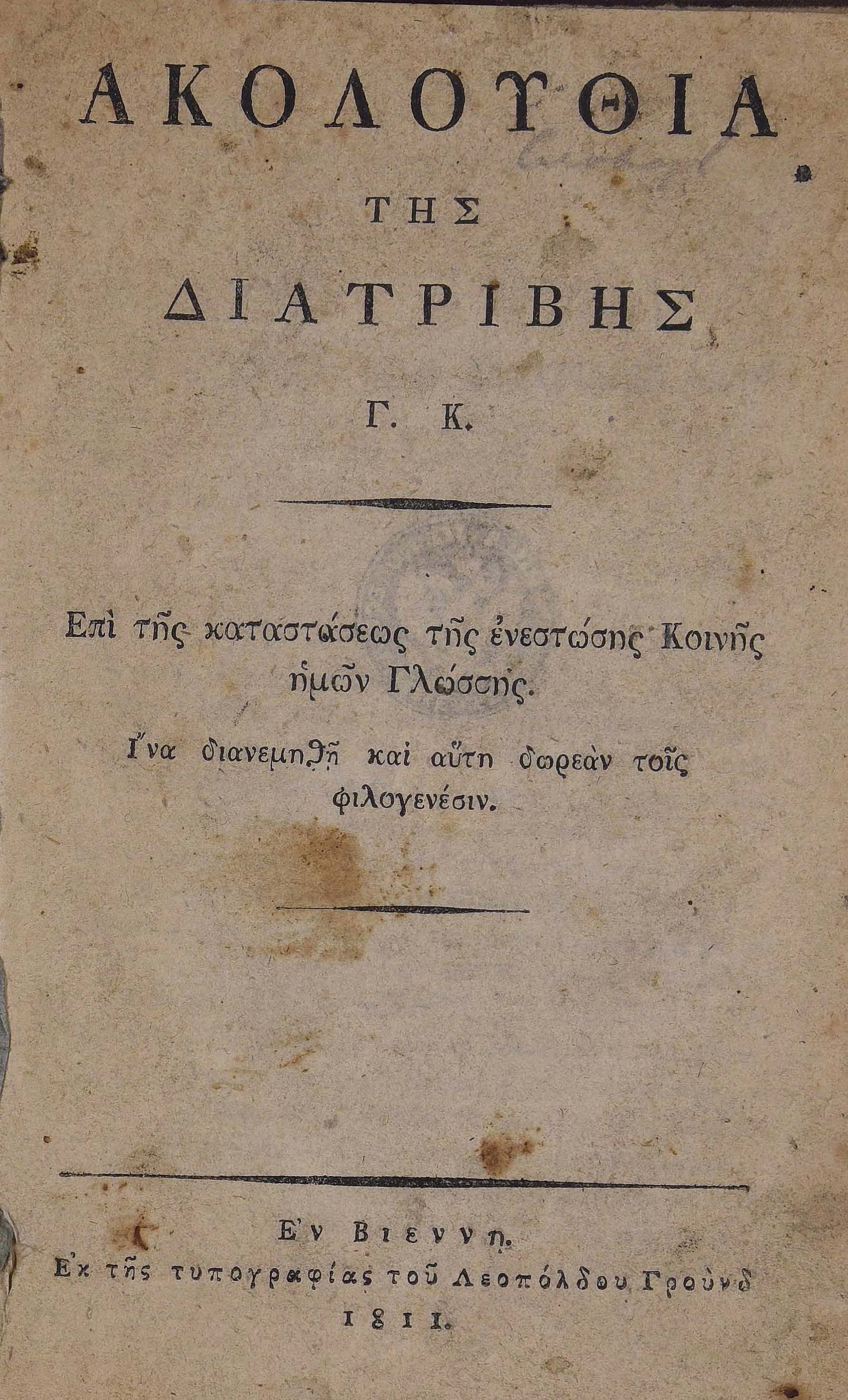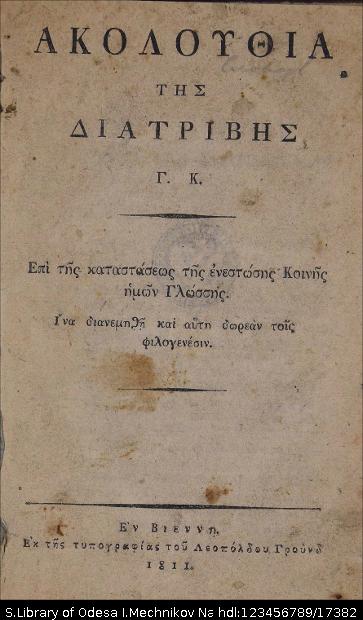 Бібліографічний опис: | [Κρομμύδας, Γεώργιος]. Ακολουθία της διατριβής : επί της καταστάσεως της ενεστώσης Κοινής ημών γλώσσης : ινά διανεμηθή και αυτή δωρεάν τοις φιλογενέσιν / Γ. Κ. – Έν Βιέννη [Wien] : εκ της τυπογραφίας του Λεοπόλδου Γρουνδ, 1811. – 16, 33-43, [1] σ. |