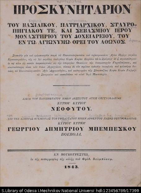 Бібліографічний опис: | Κύριλλος, ο εκ Σμύρνης. Προσκυνητάριον τοῦ βασιλικοῦ, πατριαρχικοῦ, σταυροπηγιακοῦ τε καί σεβασμίου ἱεροῦ μοναστηρίου τοῦ Δοχειαρίου, τοῦ ἐν τῷ Ἁγιωνύμῳ ‘Ορει τοθ ‘Αθωνος : Συστεθέν καί φιλοπονηθέν παρά τοῦ Πανοσιολογιωτάτου και δεβασμιωτάτου Αγίου Πρώην μεγάλου Πρωτοσυγκέλλου της του Χου μεγάλης εκκλησίας Κυρίου Κυρίου Κυρίλλου του εκ Σμύρνης εν ω προσετέθησαν εν τω τέλει εις κανών παρακλητικός εις την υπεραγίαν Θεοτόκον την θαυματουργόν Γοργουπήκοον, και εικοσιτέσσαρες οίκοι των θείων Αρχαγγέλων, / τύποις δε νυν πρώτον εκδοθέν εωιμελεία και φιλοτίμω δαπάνη του Πανοσιολογιωτάτου Αγίου Αρχιμανδρίτου, και καθηγουμένου της Σλομποξίας Κυρίου Κυρίου Γαβριήλ του Σμυρναίου και κοινοβιάτου του αυτού Ιερού Μοναστηρίου ... – Εν Βουκουρεστιω [București] : εκ της τυπογραφίας της αυλής του Φριδ. Βαλμπάουμ, 1843. – [10], 53, [3] σ., 3 εικ. |