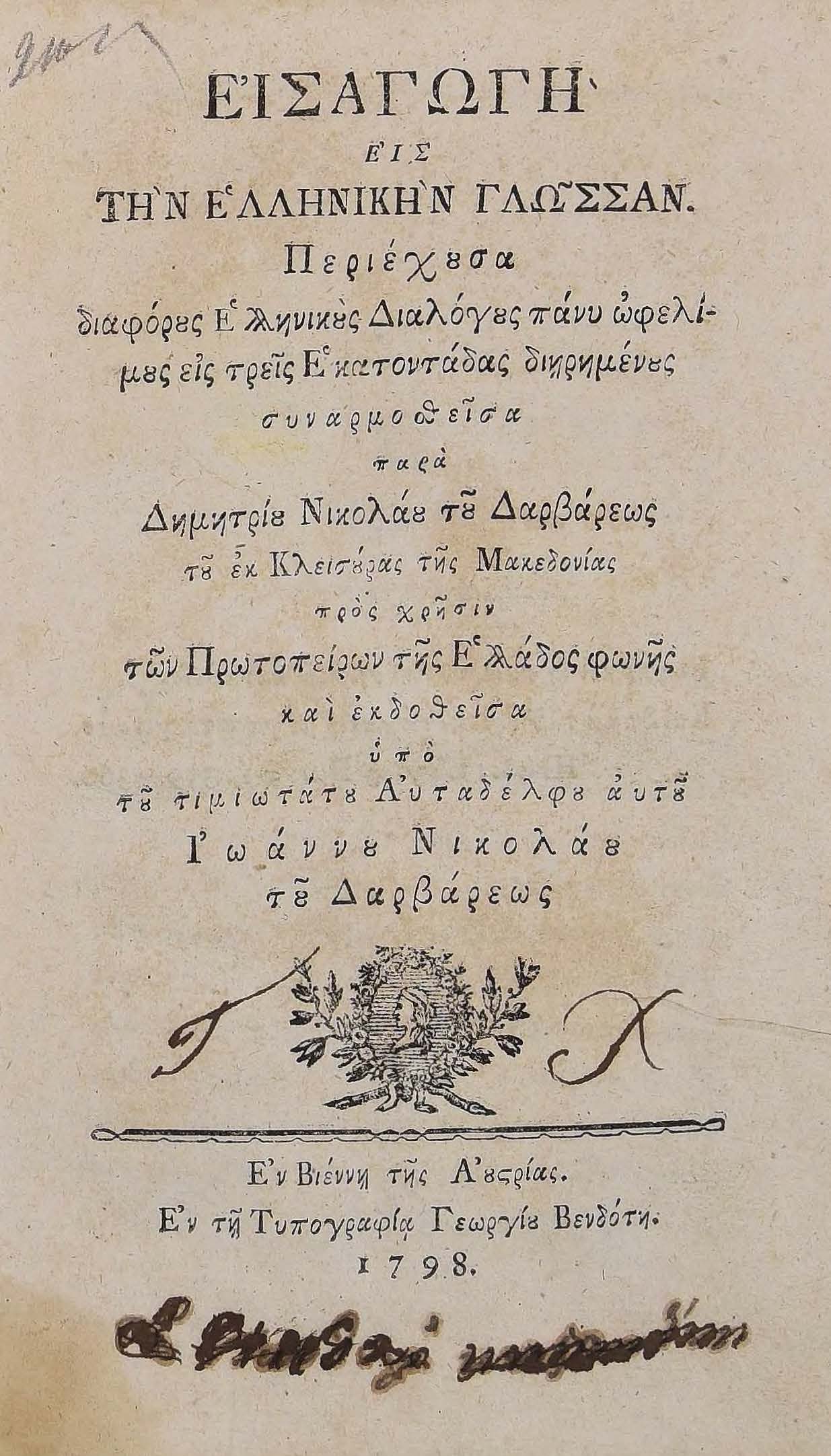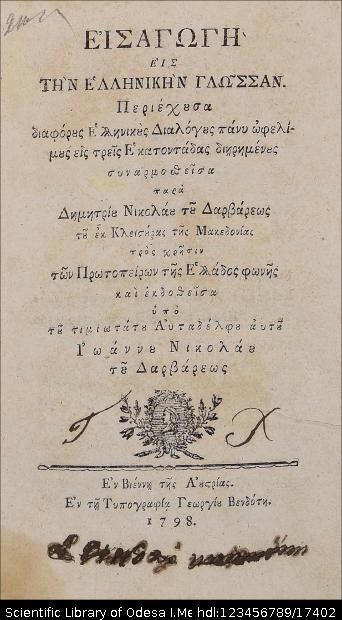 Бібліографічний опис: | Εισαγωγή εις την Ελληνικήν γλώσσαν : περιέχουσα διαφόρους Ελληνικούς Διαλόγους πάνυ ωφελίμους, εις τρεις Εκατοντάδας διηρημένους' / συναρμολογηθείσα παρά Δημητρίου Νικολάου Δαρβάρεως, του εκ Κλεισούρας της Μακεδονίας΄ Το μεν πρώτον εκδοθείσα υπό του Αυταδέλφου αυτού Ιωάννου Νικολάου του Δαρβάρεως, Νυν δε δεύτερον, Συνδρομή της Φιλογενούς Αυταδελφότητος των Ζωσιμάδων, Και επιστασία Σπυρίδωνος Βλαντή, Προς χρήσιν των Πρωτοπείρων της Ελλάδος Φωνής. – Εν Βιέννη της Αουστρίας [Wien] : εν τη τυπογραφία Γεωργίου Βενδότη, 1798. – [16], 258, [6] σ. ; 8⁰ (19х11,5х1,5 εκ). |