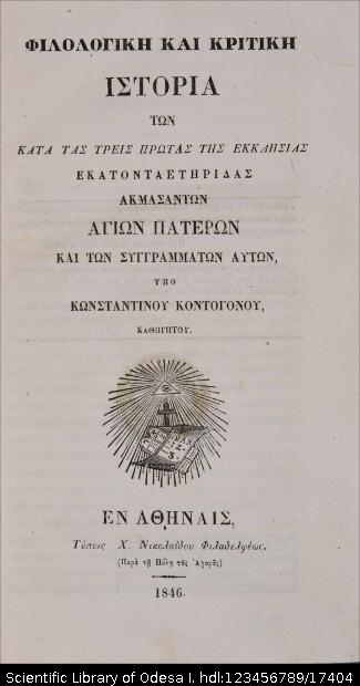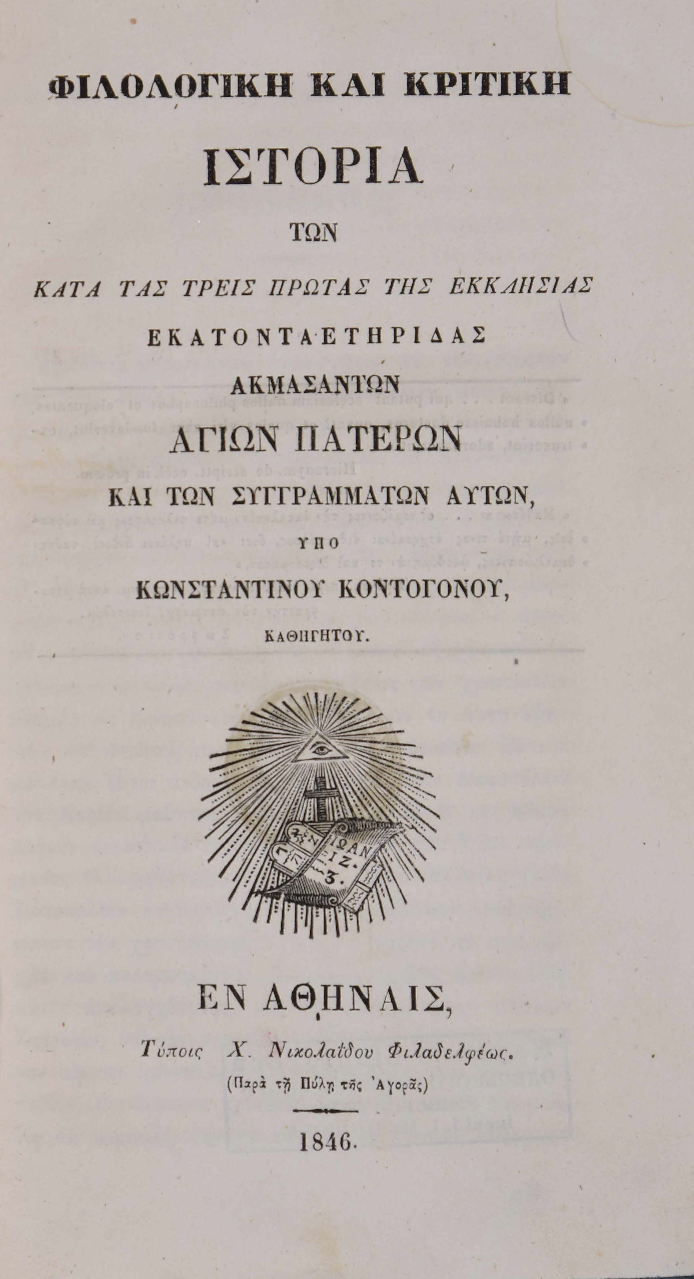 Бібліографічний опис: | Κοντογόνης, Κωνσταντίνος (1834-1909). Φιλολοηικη και κριτικη ιστορια των κατα τασ τρεισ πρωτασ τησ Εκκλησιασ εκατονταετηριδασ ακμασαντων Αγιων Πατερων και των συγγραμματων Αυτων, / υπο Κωνσταντινου Κοντογονης. – Αθηνα : Τυπ. Χ. Ν. Φιλαδελφεωσ, 1846. – [4], 6, 786 σ. |