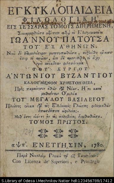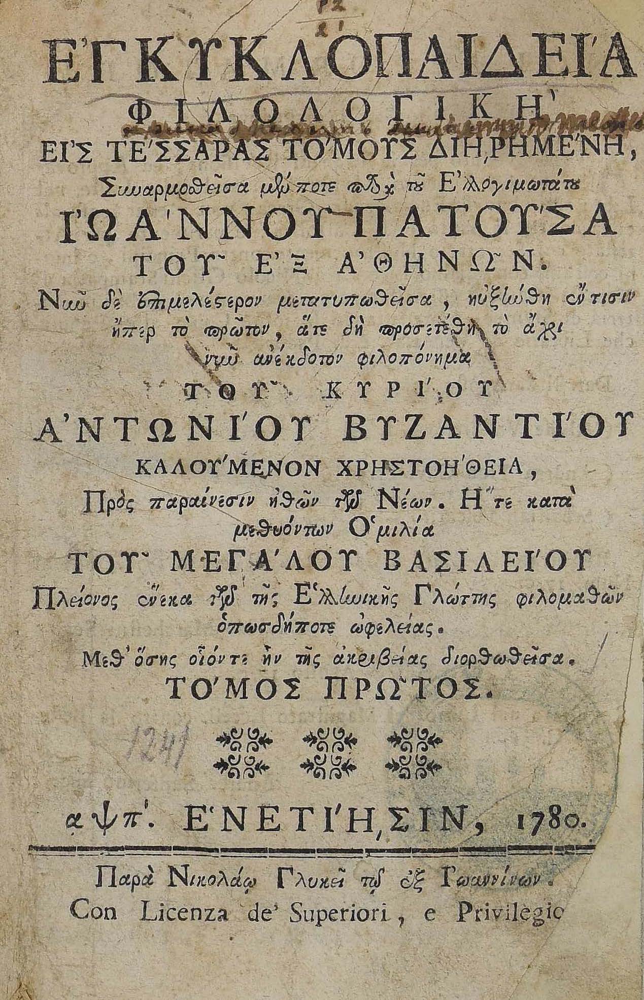 Бібліографічний опис: | Εγκυκλοπαίδεια φιλολογική : εις 4 τ. διηρημένη, / συναρμοσθείσα μεν ποτε παρά του ελλογιμωτάτου Ιωάννου Πατούσα του εξ Αθηνών ; Νυν δε επιμελέστερον μετατυπωθείσα, ηυξιώθη εν τισιν ήπερ το πρώτον, άτε δη προστέθη το άχρι νυν ανέκδοτον φιλοπόνημα του κυρίου Αντωνίου Βυζαντίου … – Ενετίησιν [Venezia] : παρά Νικολάω Γλυκεί τω εξ Ιωαννίνων, 1780. T. 1. – 1780 . – 3-479, [1] σ. ; 8º (18x11x2 σ.). |