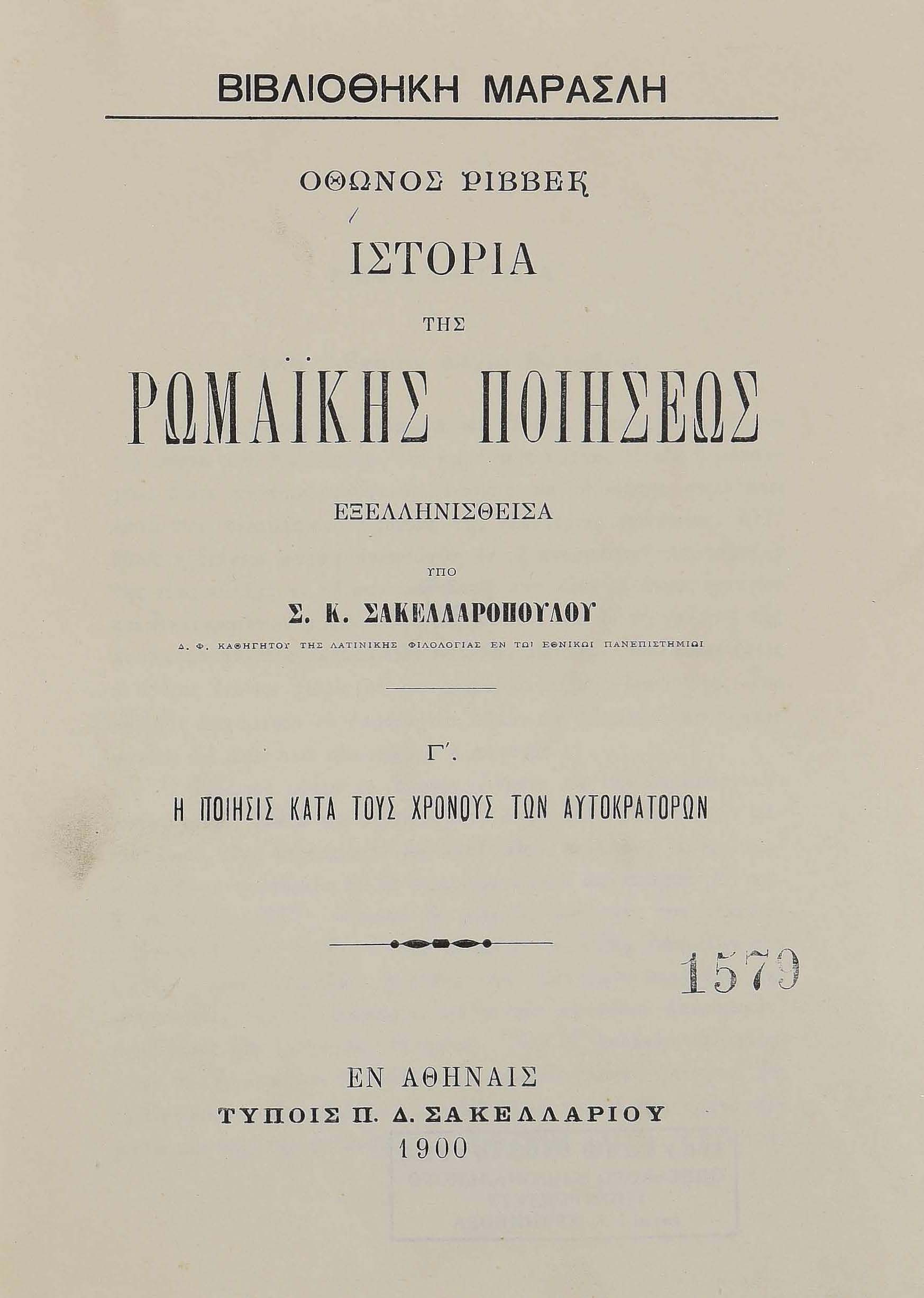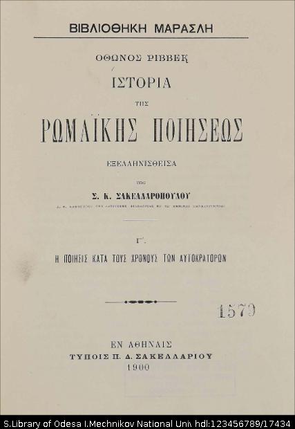 Бібліографічний опис: | Ριввеқ, Οθωνοσ (Ribbeck, Otto; 1827-1898). Ιστορια τησ ρωμαικησ ποιησεωσ : [σε 3 τ.] / εξελληνισθεισα υπο Σ. Κ. Σακελλαροπουλου … – Αφηναισ : Τυπ. Π. Δ. Σακελλαριου, 1897-1900. – (Βιβλιοθηκη Μαρασλη. Συλλογη εκκριτηων επιστημονικων χενων τε εν Ελληνικη, μεταφρασει και πρωτοτυπων συγγραμματων). Т. 3 : Η ποίησις κατά τους χρόνους των αυτοκρατόρων. – 1900. – 544, [2] σ. |