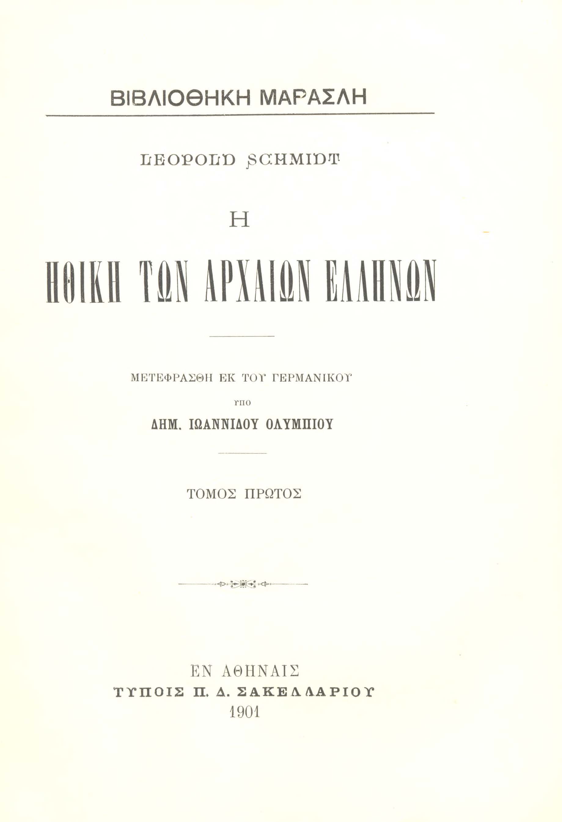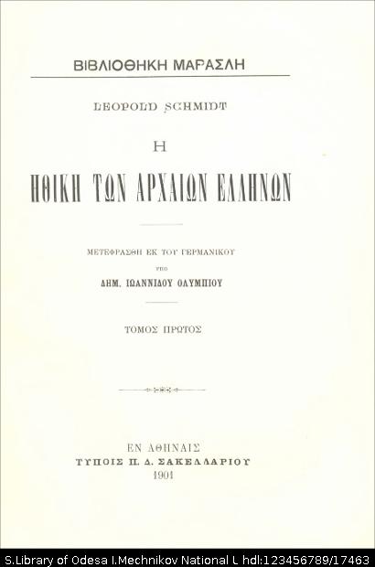 Бібліографічний опис: | Schmidt, Leopold (Σμιτ, Λεοπολδος ; 1824-1892). Η ηθικη των Αρχαιων Ελληνων : [σε 2 τ.] / μετεφρασθη εκ του γερμανικου υπο Δημ. Ιωαννιδου Ολυμπιου. – Αθηνα : Τυπ. Π. Δ. Σακελλαριου, 1901. – (Βιβλιοθηκη Μαρασλη. Συλλογη εκκριτηων επιστημονικων χενων τε εν Ελληνικη, μεταφρασει και πρωτοτυπων συγγραμματων). Т. 1. – 1901. – 491, [1] σ. |