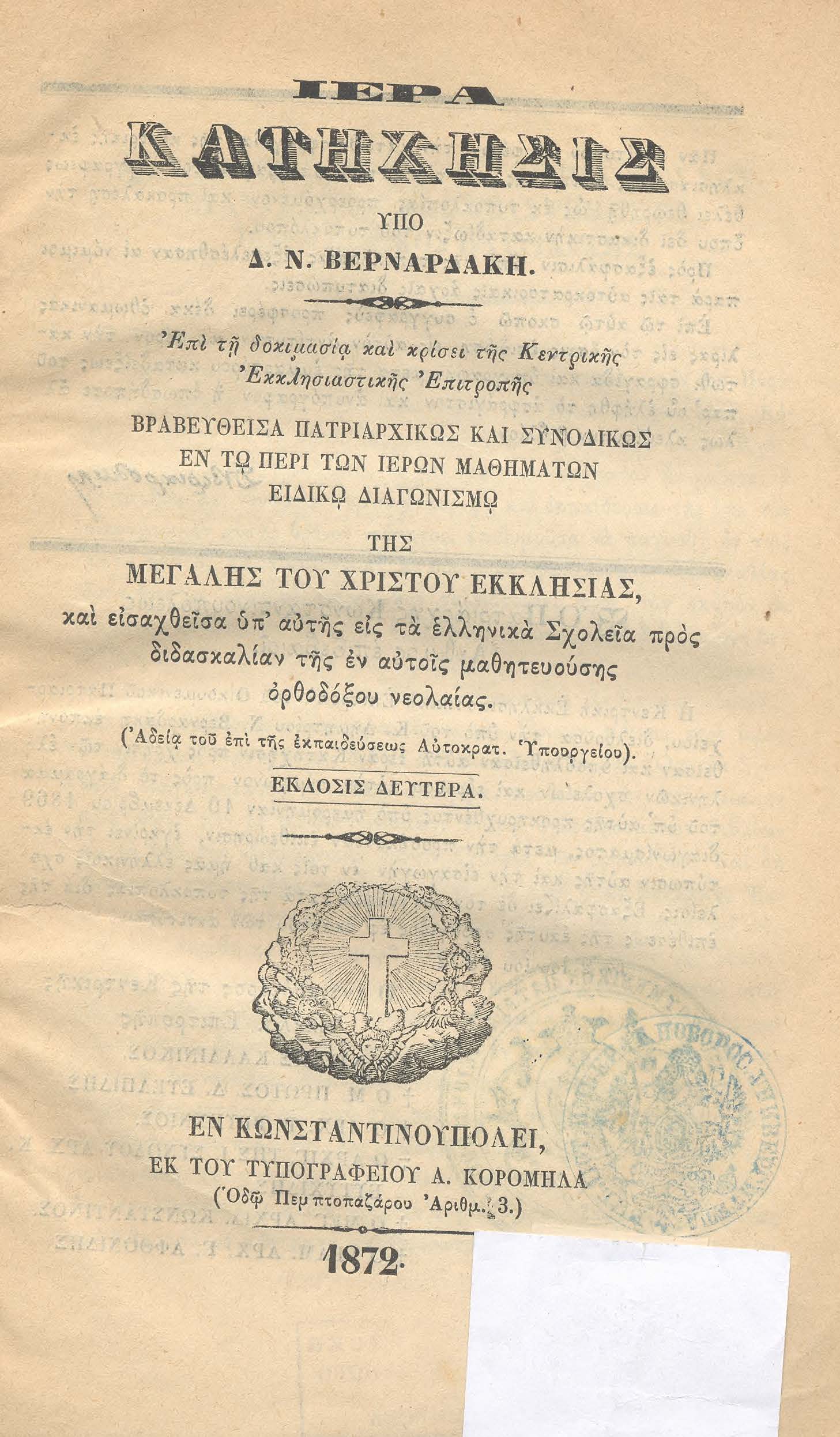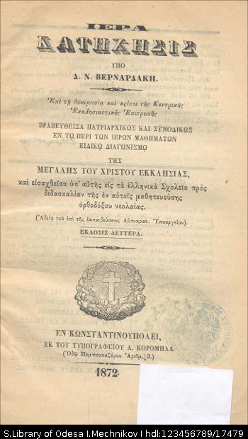Бібліографічний опис: | Βερναρδάκης, Δημήτριος Ν. (1833-1907). Ιερα Κατηχησισ / υπο Δ. Ν. Βερναρδάκης ; επί τη δοκιμασία και κρίσει της Κεντρικής Εκκλησιαστικής Επιτροπής βραβευθείσα πατριαρχικώς και συνοδικώς εν τω περί των Ιερών Μαθημάτων ειδικώ διαγωνισμώ της Μεγάλης του Χριστού Εκκλησίας, και εισαχθείσα υπ' αυτής εις τα ελληνικά Σχολεία προς διδασκαλίαν της εν αυτοίς μαθητευούσης ορθοδόξου νεολαίας ... – 2η εχδ. – Κωνσταντινουπολη [İstanbul] : Εκ της Τυπ. Α. Κορομηλα, 1872. – 256 σ. |