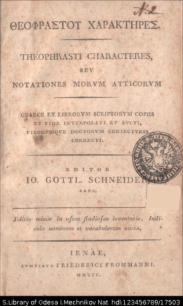 | Citation: | Θεόφραστος Ἐρέσιος (Theophrastus Eresius ; 370 π. Χ. – 288/285 π. Χ.). Θεόφραστου χαρακτηρεσ = Theophrasti Characteres, seu Notationes morum Atticorum : graece ; ex librorum scriptoum copiis et fide interpolate et aucti, virorumque doctorum coniecturis correcti / editor Io. Gottl. Schneider ... – Ienae [Jena] : sumtibus Friderici Frommanni, 1800 . – [8], 239, [1] p. ; 8º (17,5х10,5х1,1 cm). |