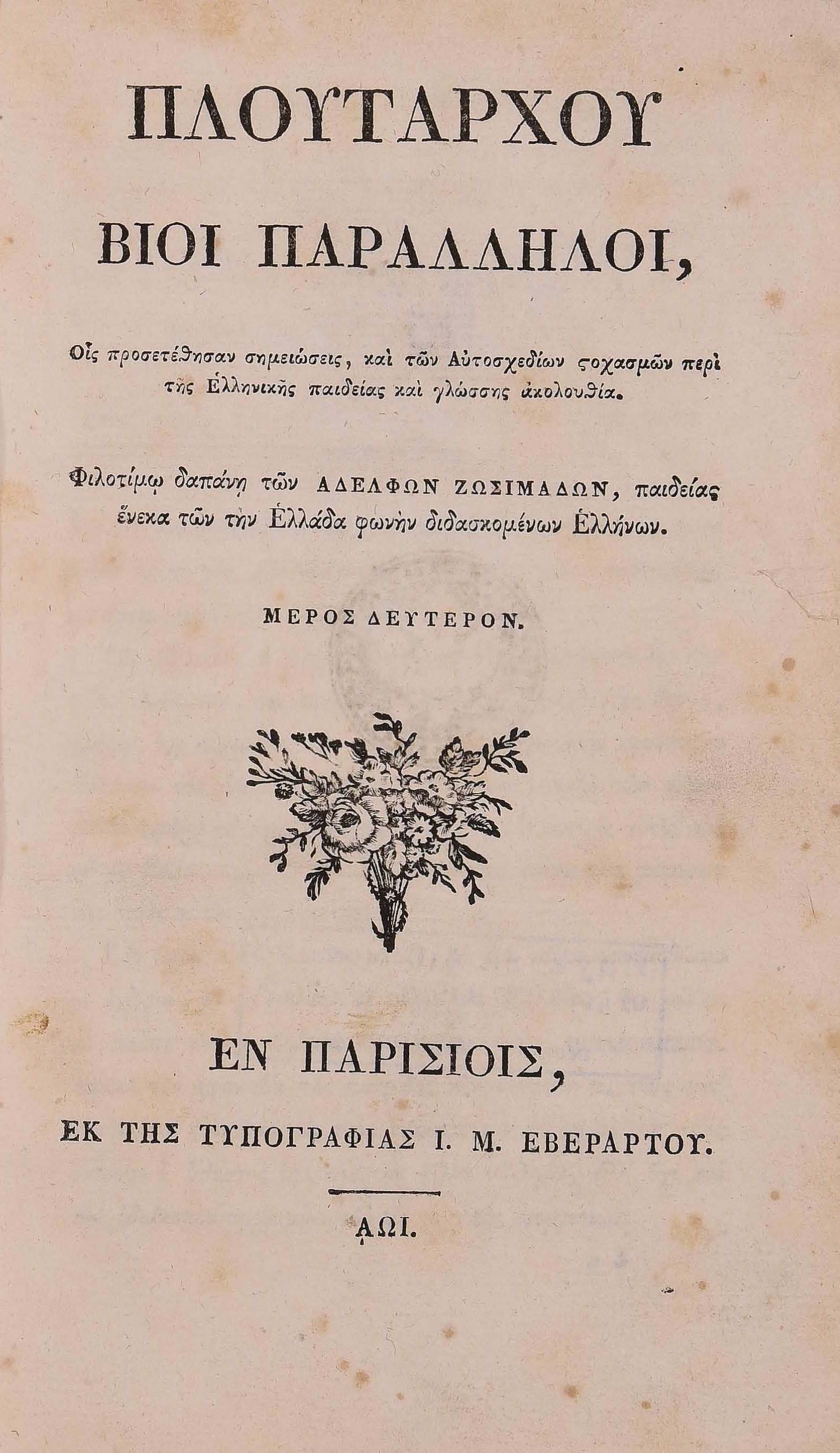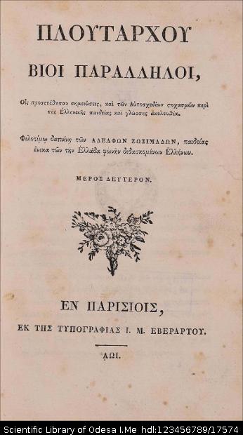 | Бібліографічний опис: | Πλούταρχος (Plutarchus ; περ. 45 – περ. 127). Πλουτάρχου Βίοι Παράλληλοι, Οις προσετέθησαν σημειώσεις, και των Αυτοσχεδίων στοχασμών περί της Ελληνικής παιδείας και γλώσσης ακολουθία : [σε 6 τ.]. – Εν Παρισίοις [Paris] : εκ της Τυπογραφίας Ι. Μ. Εβεράρτου, 1809-1814. – (Ελληνική Βιβλιοθήκη, τ. 40, 44, 53, 63). T. 2 (44). – 1810. – [36], 488 σ., απ. |