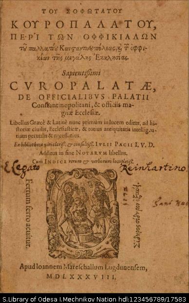 | Citation: | Κωδινός, Γεώργιος (Codinus, Georgius ; 15ος α.). Του σοφώτατου Κουροπαλάτου, Περί των οφίκιαλων του παλλάτου Κωνσταντινουπόλεως, και των οφίκιων των μεγάλων Εκκλησίας = Sapientissimi Curopalatae, De officialibus palatii Constantinopolitani, et officiis magnae Ecclesiae : libellus Graece et Latine nunc primum in lucem editus, ad historiae civilis, ecclesiasticae, et totius antiquitatis intelligentiam perutilis et necessarius : ex bibliotheca viri... Julii Pacii I.V.D. Additus in fine notarum libellus. Cum indice rerum et verborum locupletiss. – Lugduni [Lyon] : apud Ioannem Mareschallum, 1588. – [9], 425 p. ; 8º (16 cm). |