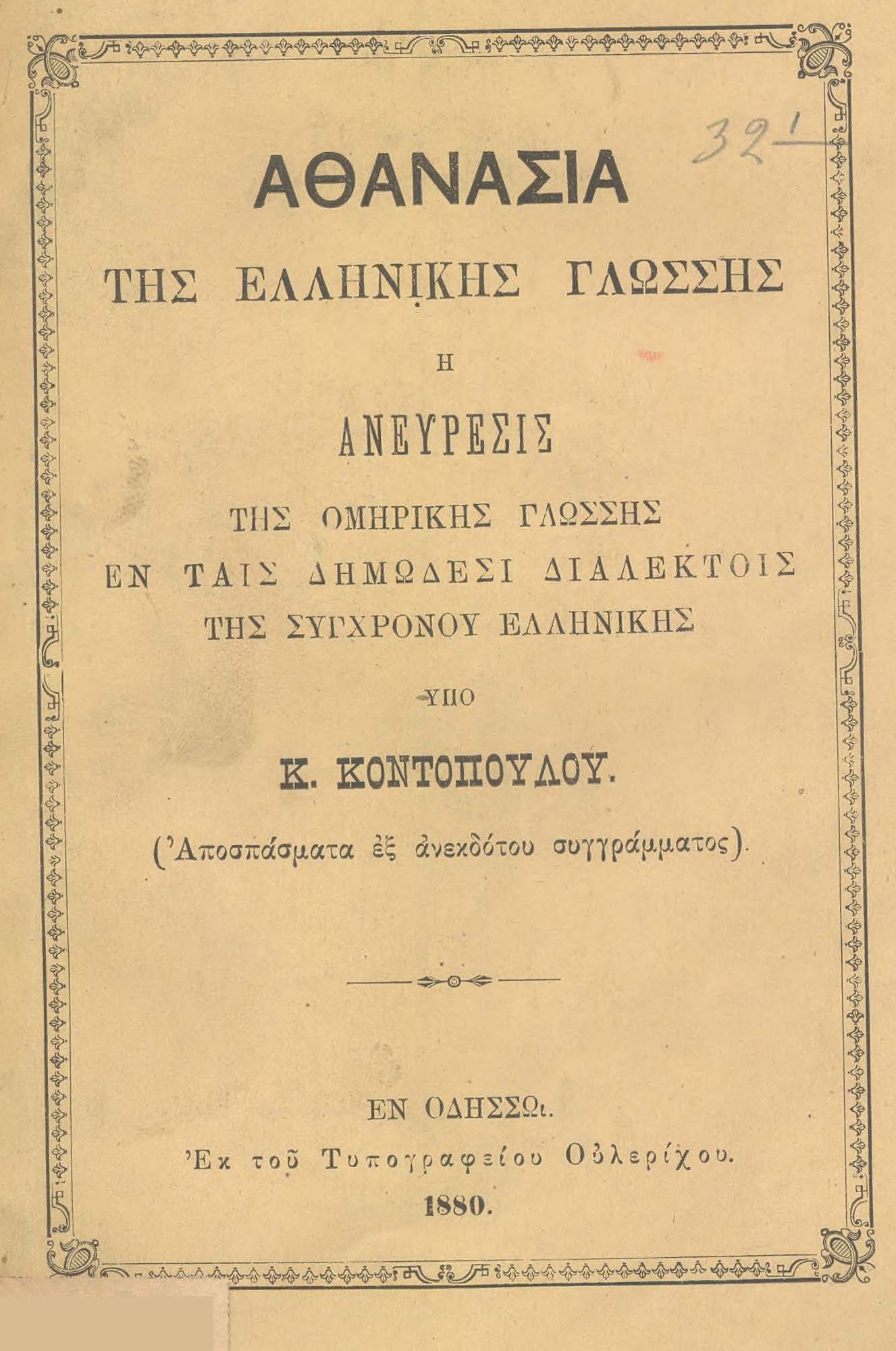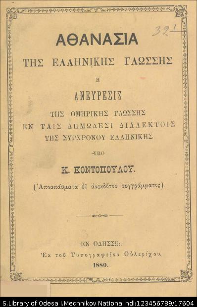 | Бібліографічний опис: | Κοντοπουλος, Κωνσταντινος (1832-1910). Αθανασία της Ελληνικής Γλώσσης : η ανεύρεσις της ομηρικής γλώσσης εν ταις δημωδέσι διαλέκτοις της συγχρόνου ελληνικής … : αποσπάσματα εξ ανεκδότου συγγράμματος / υπο Κ. Κοντoπουλου. – Οδησσός [Одеса] : τυπ. Ουλεριχου, 1880. – [2], 59, [1] σ. |