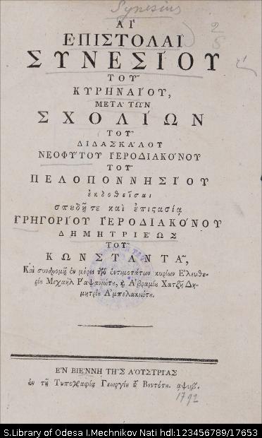 Бібліографічний опис: Συνέσιος ο Κυρηναίος (Sinesius Cyrenensis ; πιθ. 370 – πιθ. 414). Αι επιστολαί Συνεσίου του Κυρηναίου, / μετά των σχολίων του διδασκάλου Νεοφύτου Ιεροδιακόνου του Πελοποννησίου ; εκδοθείσαι σπουδή τε και επιστασία Γρηγορίου Ιεροδιακόνου Δημητριέως του Κωνσταντά … – Εν Βιέννη της Αουστρίας [Wien] : εν τη Τυπογραφία Γεωργίου του Βεντότου, 1792. – [8], 256, [4] p. ; 8° (22x14x1,5 εκ.).
