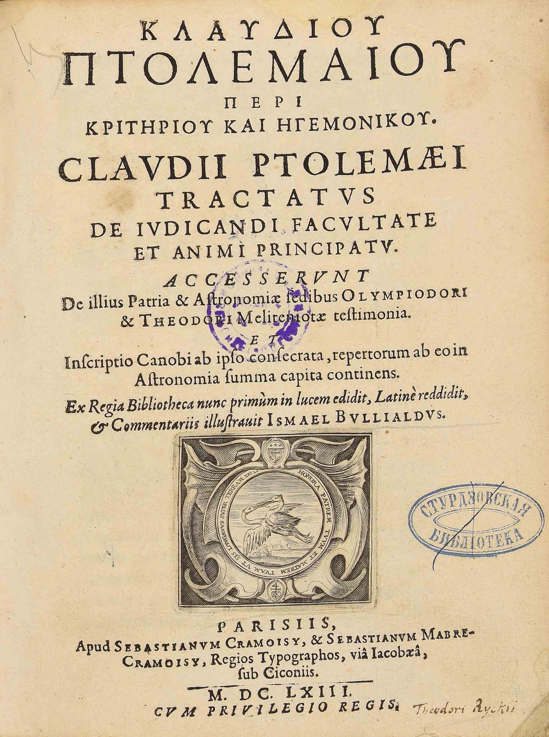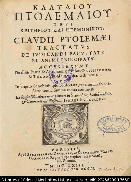 | Бібліографічний опис: | Πτολεμαῖος, Κλαύδιος (Ptolemaeus, Claudius, ca 100 – 170 ae. n.). Κλαύδιου Πτολεμαῖου περί κριτηρίου και ηγεμονικού = Claudii Ptolemaei Tractatus de iudicandi facultate et animi principatu ; accesserunt De illius Patria et Astronomae sedibus Olympiodori et Theodori Melitenioae testimonia. Et inscriptio canobi ab ipso consecrata, repertorum ab eo in Astronomia summa capita continens ; ex regia bibliotheca nunc primum in lucem edidit, / latine reddidit et commentariis illustravit Ismael Bullialdus. – Parisiis [Paris] : apud Sebastianum Cramoisy, et Sebastianum Mabre-Cramoisy ..., 1663. – [14], 248, [8] p. ; 4° (23x17,5x1,5 cm). |