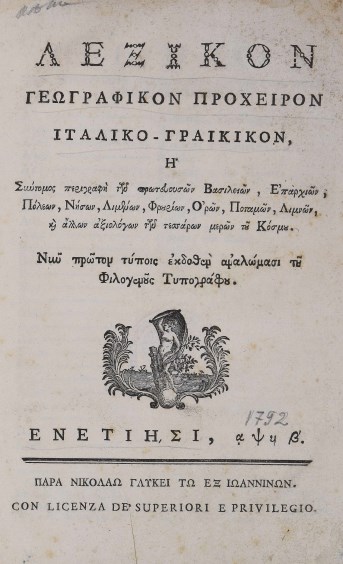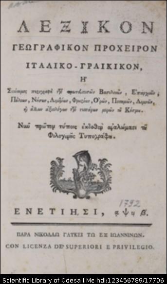 | Назва: | Λεξικον γεωγραφικον προχειρον ιταλικο-γραικικον |