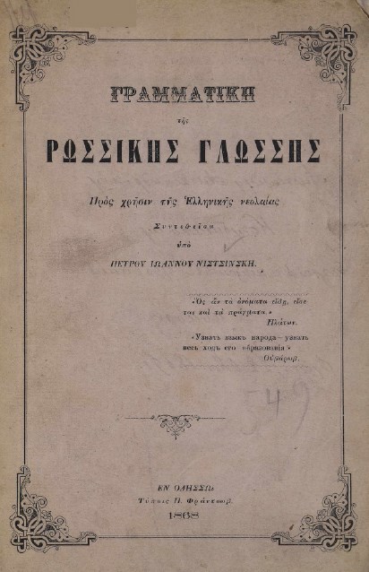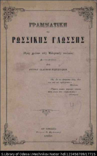| Бібліографічний опис: | Γραμματικη της ρωσσικησ γλωσσησ : προς χρησιν την ελληνικής νεολαίας / συντεθεισα υπο Π. Ι. Νιστσινσκη. – Οδησσός [Одеса] : Τυπ. Π. Φραντσωβ, 1868. – [4], 18, [2], 136, [2] σ. : εικ. |