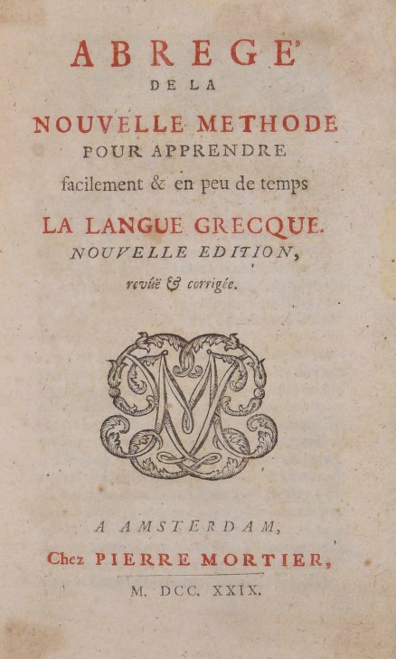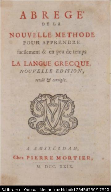 Бібліографічний опис: [Lancelot, Claude (1615–1695)]. Abrégé de la nouvelle méthode pour apprendre facilement et en peu de temps la langue grecque. – Nouvelle edition, revûë et corrigée. – A Amsterdam : chez Pierre Mortier, 1729. – VIII, 192 p. , 3 f. tabl. ; 8° (16,5x10,4x1 cm).