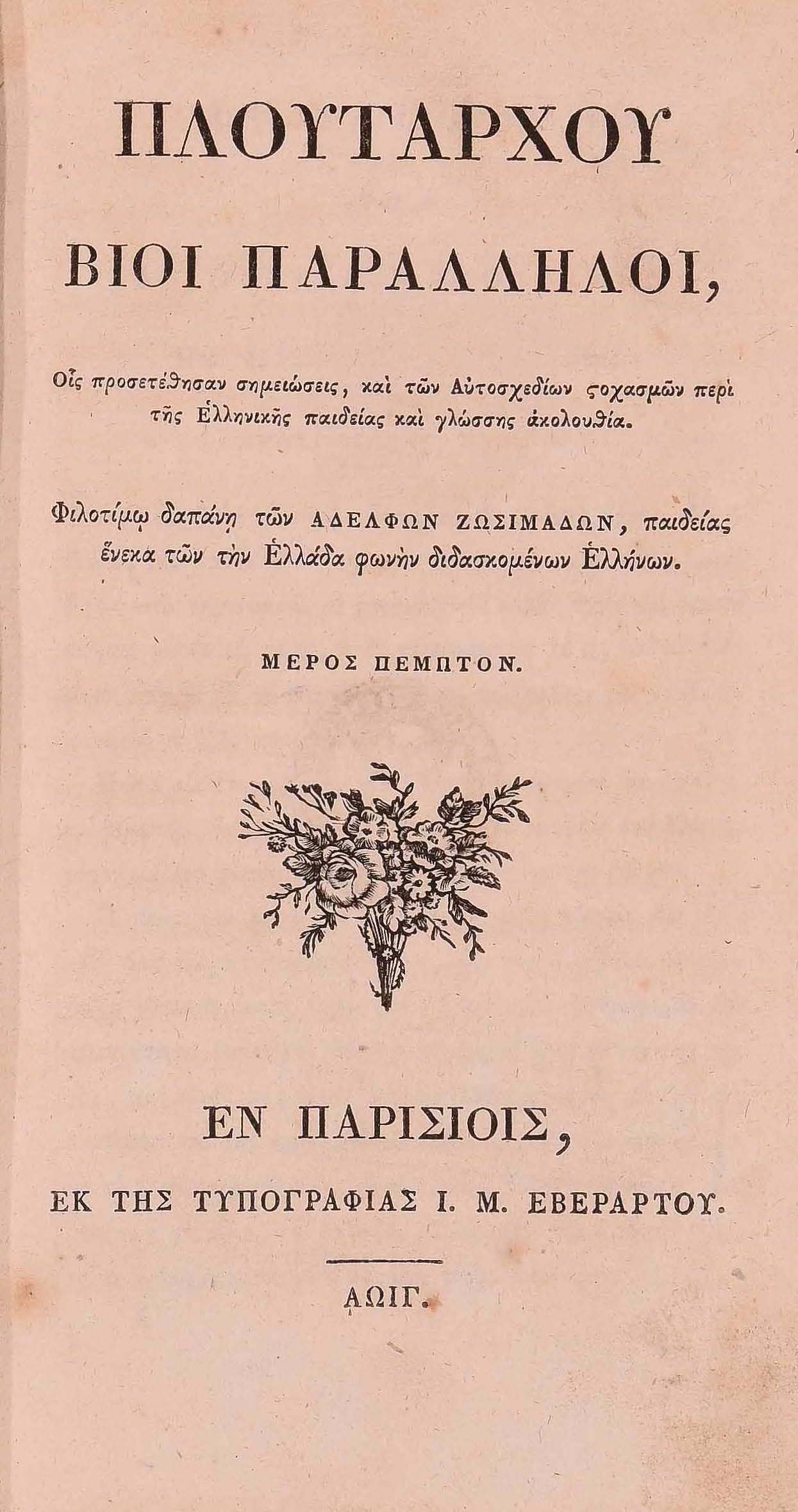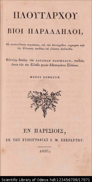 | Бібліографічний опис: | Πλούταρχος (Plutarchus ; περ. 45 – περ. 127). Πλουτάρχου Βίοι Παράλληλοι, Οις προσετέθησαν σημειώσεις, και των Αυτοσχεδίων στοχασμών περί της Ελληνικής παιδείας και γλώσσης ακολουθία : [σε 6 τ.]. – Εν Παρισίοις [Paris] : εκ της Τυπογραφίας Ι. Μ. Εβεράρτου, 1809–1814. – (Ελληνική Βιβλιοθήκη, τ. 40, 44, 53, 63). T. 5 (53). – 1813. – [28], 472 σ., απ. |
