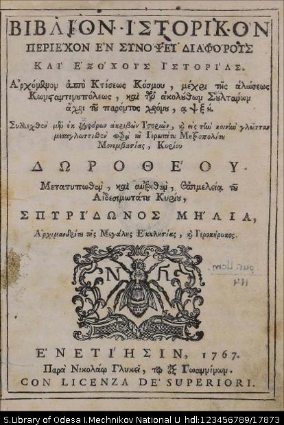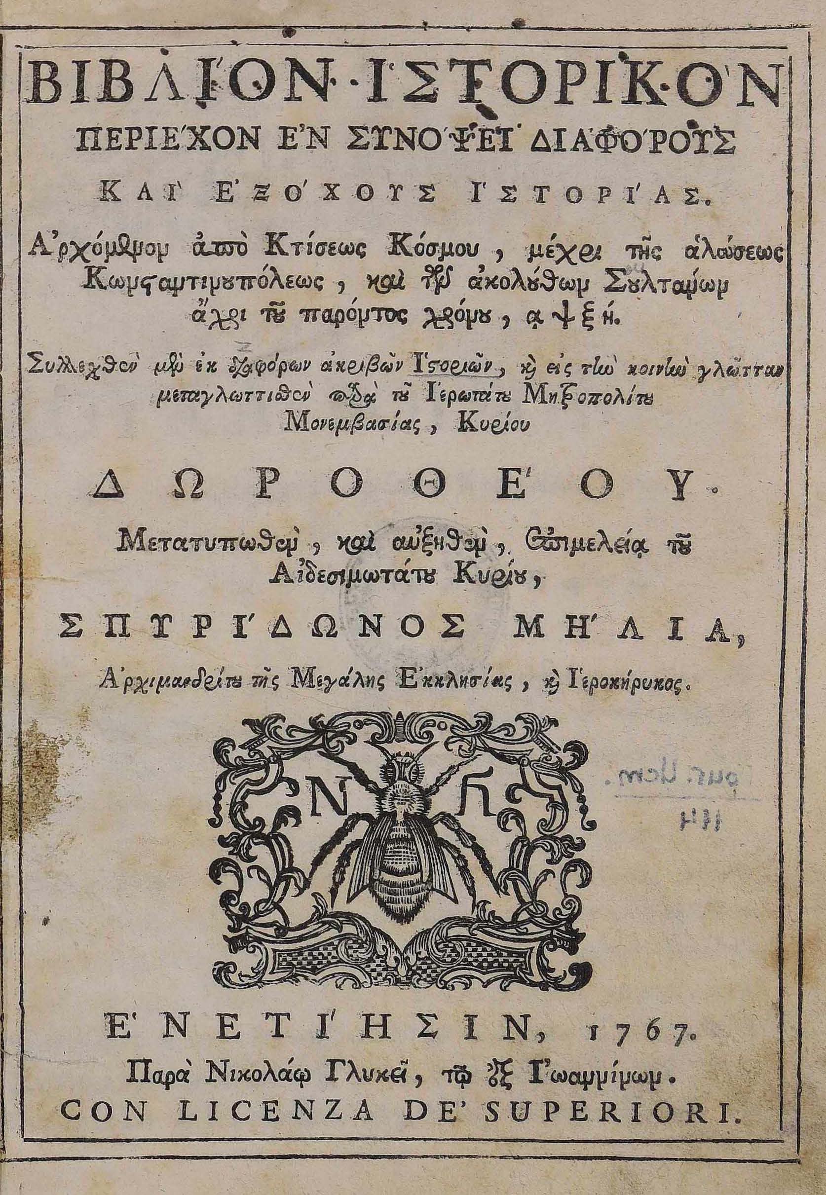 Бібліографічний опис: Βιβλίον ιστορικόν περιέχον εν συνόψει διαφόρους και εξόχους ιστορίας : αρχόμενον από κτίσεως κόσμου, μέχρι της αλώσεως Κωνσταντινουπόλεως, και των ακολούθων Σουλτάνων : συλλεχθέν μεν εκ διαφόρων ακριβών Ιστοριών, και εις την κοινήν γλώτταν / μεταφρασθέν παρά του ιερωτάτου μητροπολίτου Μονεμβασίας, Κυρίου Δωροθέου. Νυν δε μετατυπωθέν, και επιμελώς διορθωθέν. – ̓Ενετιησιν [Venezia] : παρά Νικολάω Γλυκεί τω εξ Ιωαννίνων, con licencia de Superiori, 1767. – 52, 554 σ. ; 4º (22х17х3 εκ.).