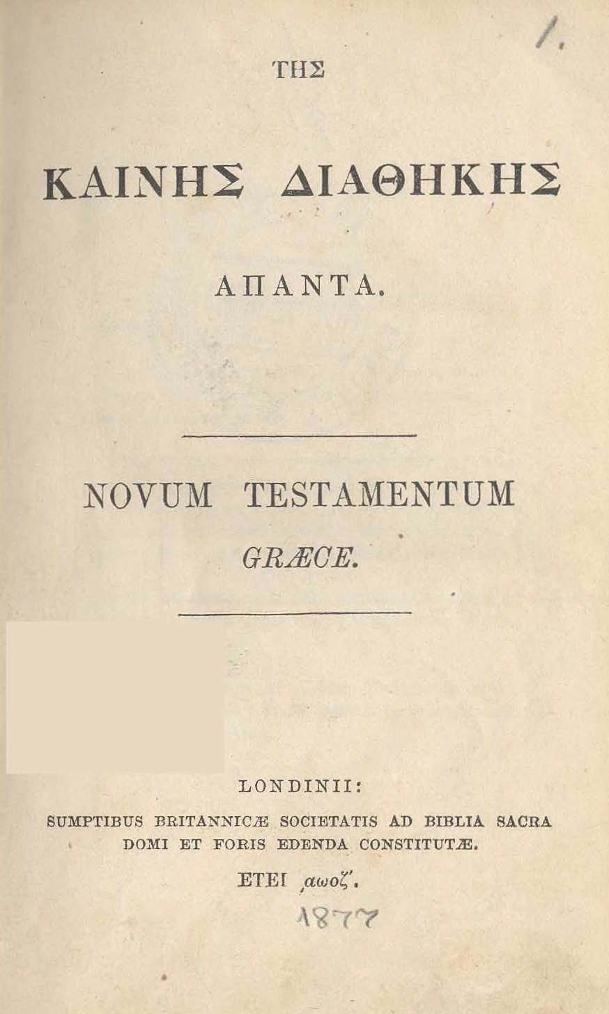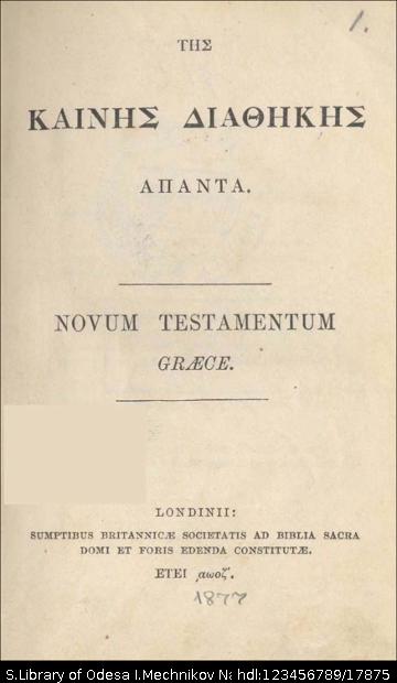 Бібліографічний опис: Της Καινης Διαθηκης ἁπαντα = Novum Testamentum, Graece. – Londinii [London] : sumptibus Britannicæ Societatis ad Biblia Sacra, 1877. – [2] 568, [2] σ.