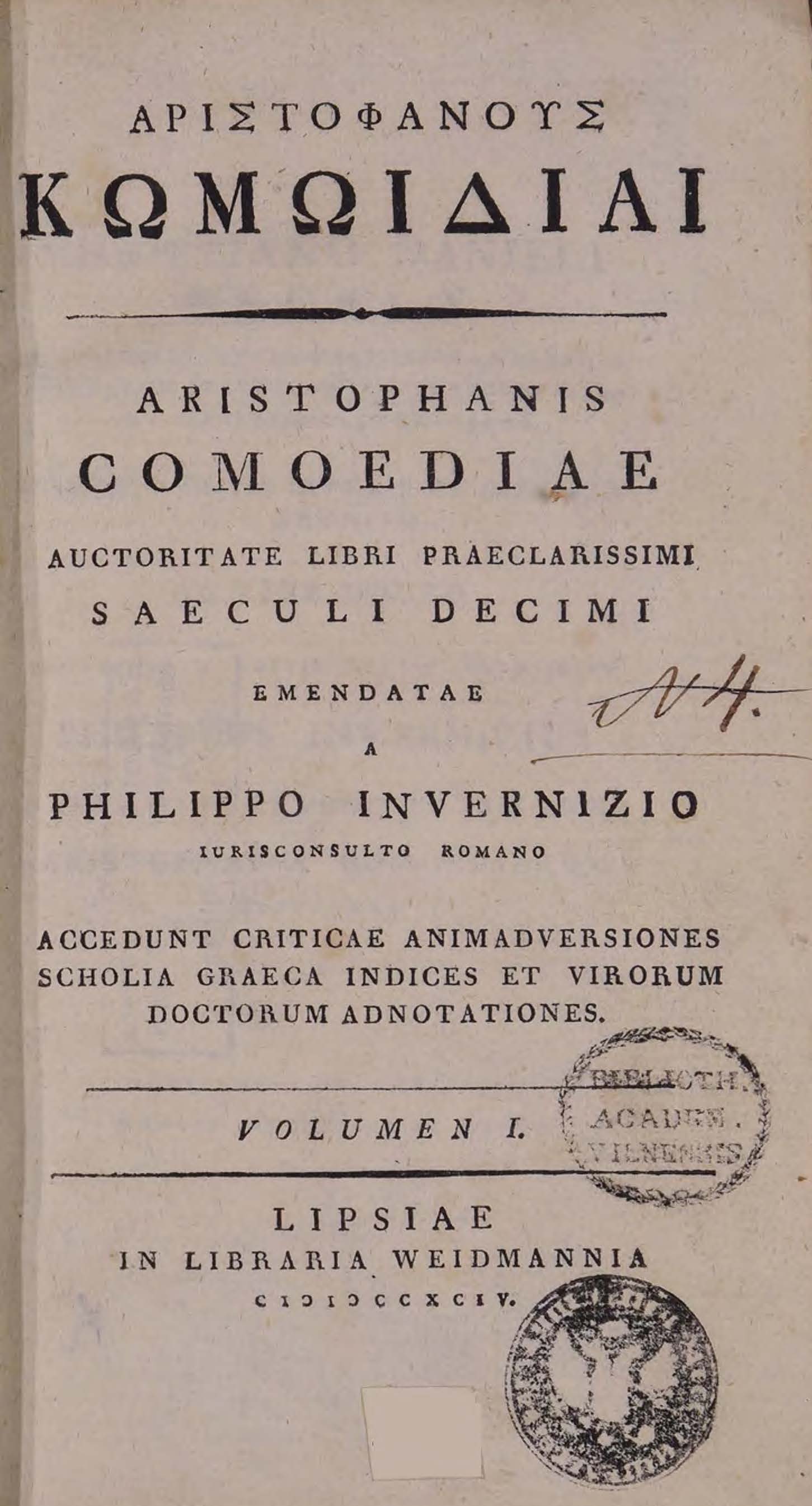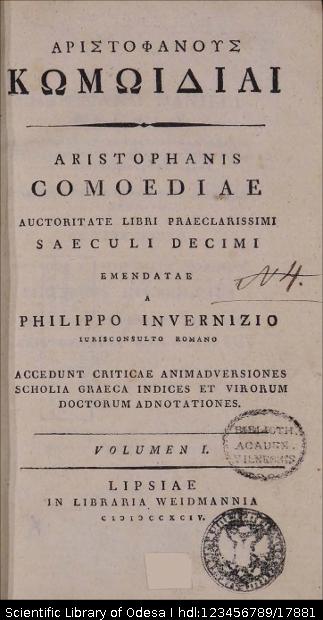Бібліографічний опис: Αριστοφάνησ (Aristophanes ; 445 π. Χ. – 386 π. Χ.). Αριστοφανουσ κωμωιδιαι = Aristophanis comoediae : auctoritate libri praeclarissimi saeculi decimi : [in 2 vol.] / emendatae a Philippo Invernizio ... ; accedunt criticae animadversiones, scholia graeca et virorum doctorum adnotationes. – Lipsiae [Leipzig] : іn libraria Weidmannia, 1794. Vol. 1. – 1794. – XXXVI, 603, [1] p., 1 f. tabl. ; 8⁰ (20,5x12x3,5 cm).