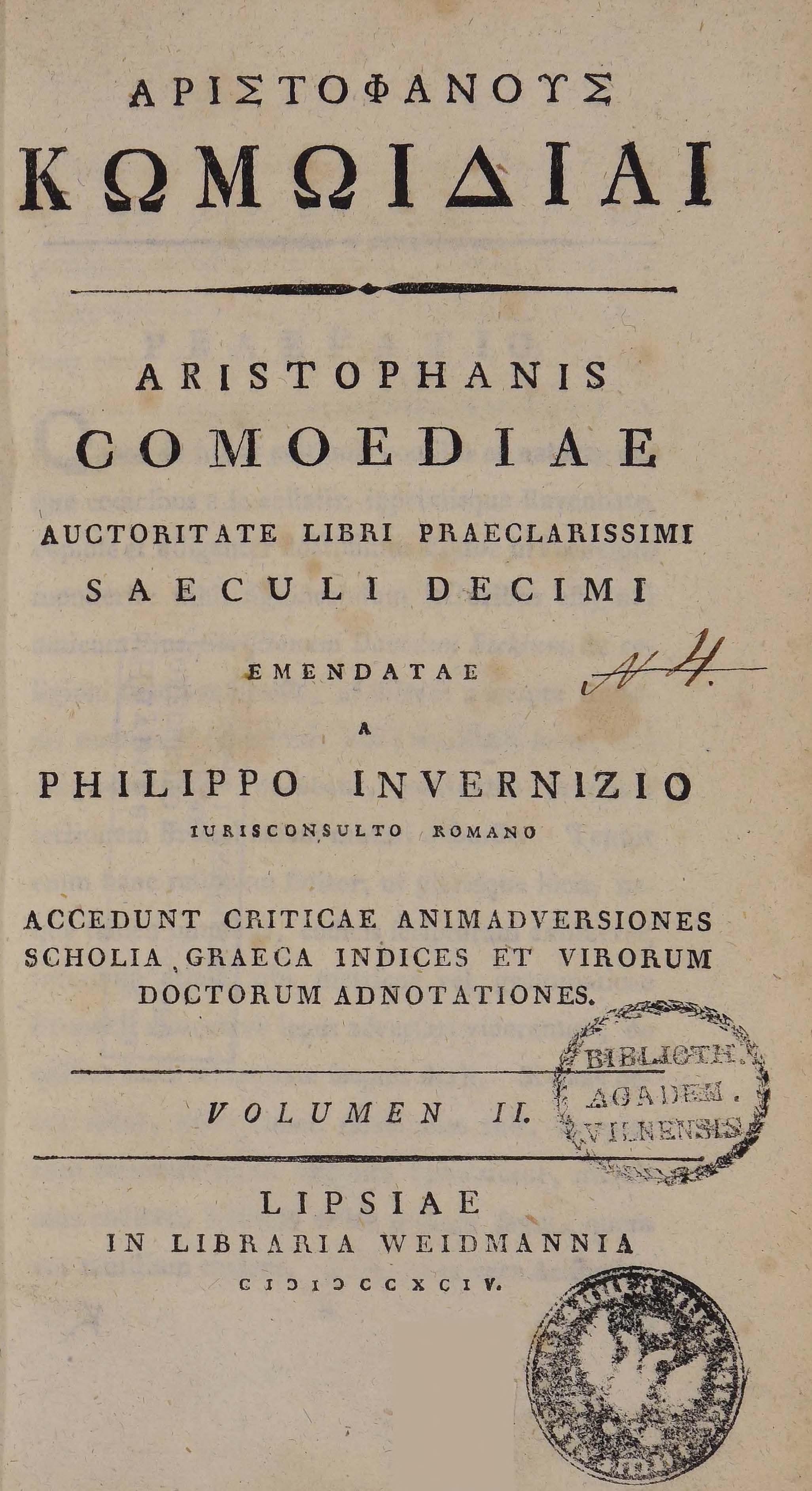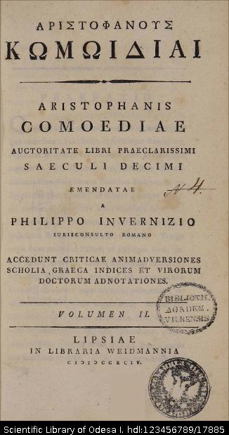 | Бібліографічний опис: | Αριστοφάνησ (Aristophanes ; 445 π. Χ. – 386 π. Χ.). Αριστοφανουσ κωμωιδιαι = Aristophanis comoediae : auctoritate libri praeclarissimi saeculi decimi : [in 2 vol.] / emendatae a Philippo Invernizio ... ; accedunt criticae animadversiones, scholia graeca et virorum doctorum adnotationes. – Lipsiae [Leipzig] : іn libraria Weidmannia, 1794. Vol. 2. – 1794. – IV, 3-606 p. ; 8⁰ (20,5x12x3,2 cm). |