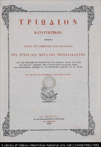 Бібліографічний опис: Τριώδιον Κατανυκτικόν : περιέχον άπασαν την ανήκουσαν αυτώ Ακολουθίαν της Αγίας και Μεγάλης Τεσσαρακοστής από της Κυριακής του Τελώνου και του Φαρισαίου μέχρι του Αγίου και Μεγάλου Σαββάτου μετά των κατ'ήχον τριαδικών ύμνων και φωταγωγικών στιχηρών τε και καθισμάτων διαφόρων, εν τω τέλει … –Βενετια [Venezia] : Εκ της εκκαησιαστικης τυπ. του Φοινικος, 1856. – [4], 455, [1] σ.