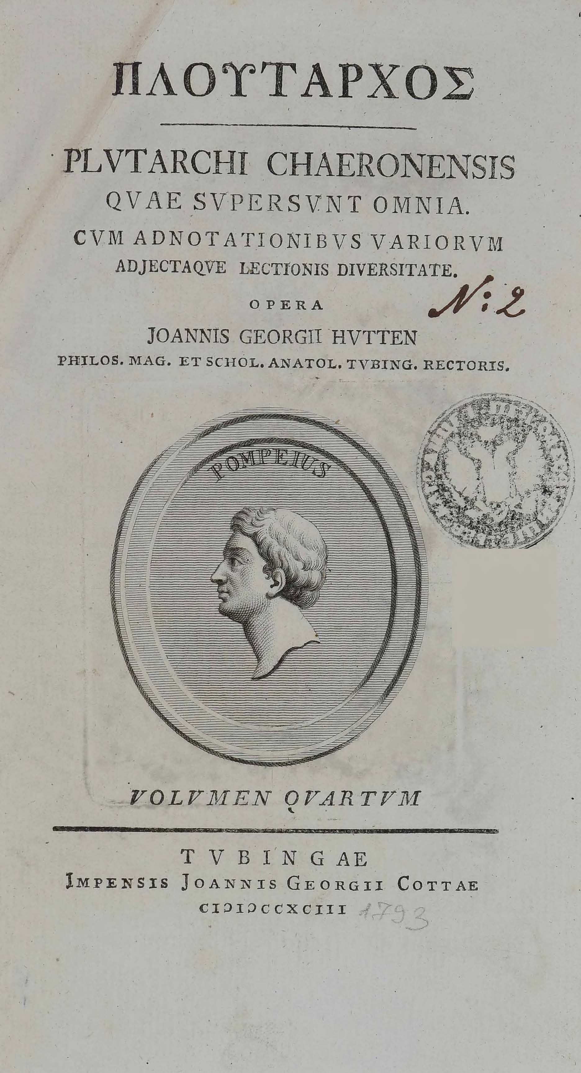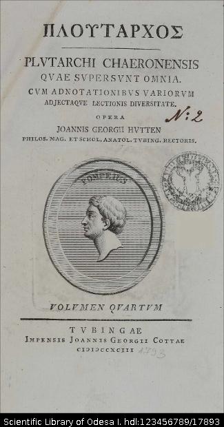 | Бібліографічний опис: | Πλουταρχος (Plutarchus ; περ. 46 – 120 μ. Χ.). Plutarchi Chaeronensis quae supersunt omnia : cum adnotationibus variorum adjectaque lectionis diversitate : [in 14 vol.] / opera Johannis Georgii Hutten ... – Tubingae [Tübingen] : imprensis Joannis Georgii Cottae, 1791–1804. Vol. 4. – 1793. – [6], 452 p. ; 8⁰ (20,5x11,5x1,8 cm). |