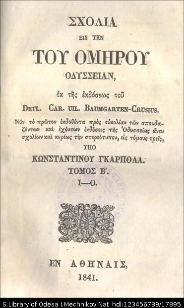 | Бібліографічний опис: | Baumgarten-Crusius, Detlev Karl Wilhelm (1788-1843). Σχόλια εις την του Ομήρου Οδύσσειαν : [σε 3 τ.] / εκ της εκδόσεως του Detl. Car. Guil. Baumgarten-Crusius ; νυν το πρώτον εκδοθέντα προς ευκολίαν των σπουδαζόντων και εχόντων εκδόσεις της Οδυσσείας άνευ σχολίων, και κυρίως την στερεότυπον, υπό Κωνσταντίνου Γκαρπολά. – Αθηνα : Τυπ. Κ. Γκαρπολά, 1841. Τ. 3 : Π-Ω. – 1841. – [2], 229, [1] σ. |