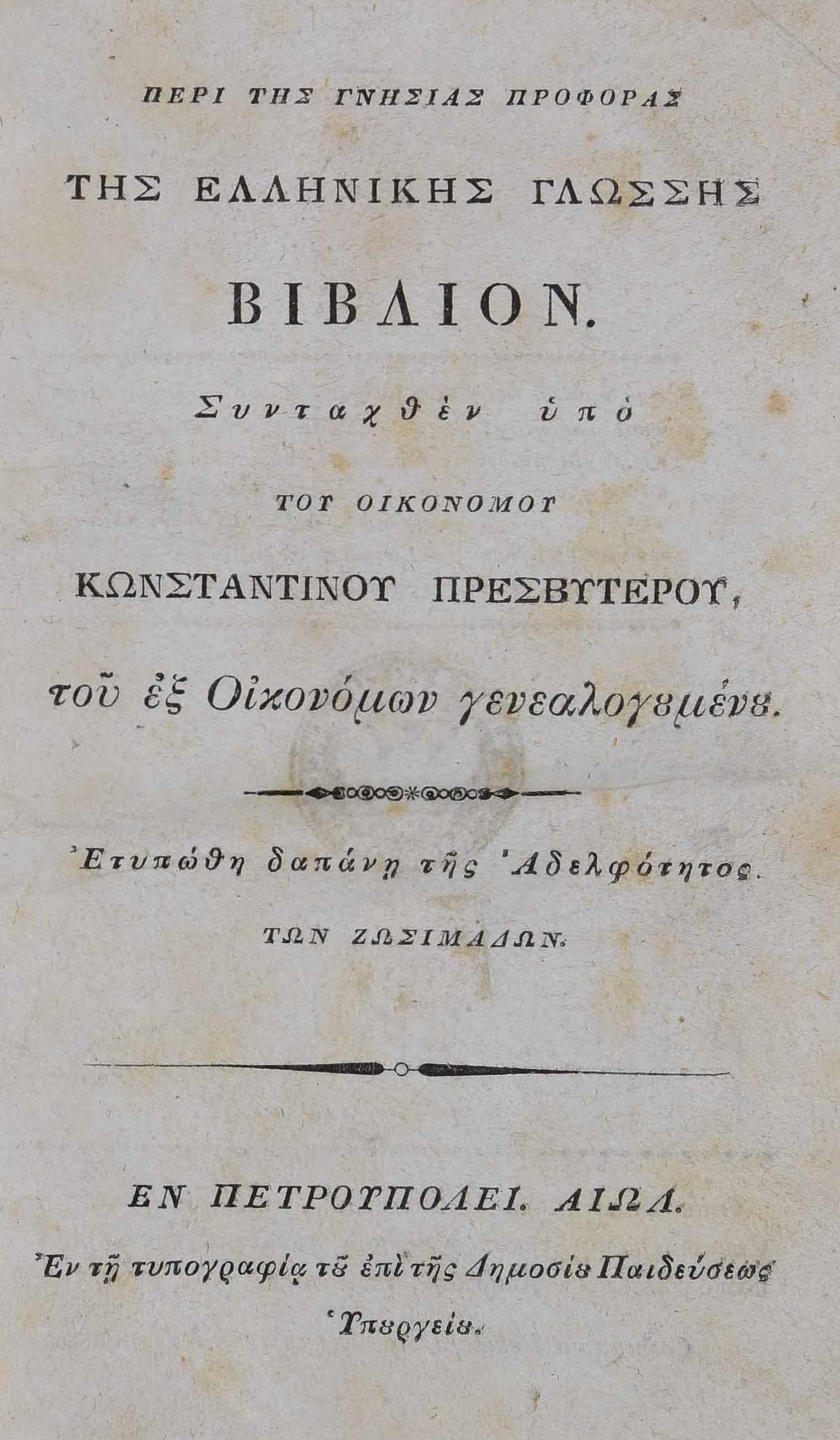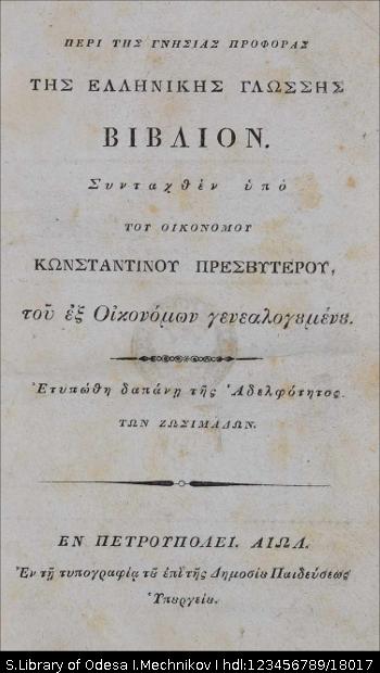 Бібліографічний опис: Οικονόμου, Κωνσταντίνος (Οικονόμος; 1780-1857). Περί της γνησίας προφοράς της ελληνικής γλώσσης Βιβλίον / Συνταχθέν υπό του Οικονόμου Κωνσταντίνου πρεσβυτέρου, του εξ Οικονόμων γενεαλογουμένου. Ετυπώθη δαπάνη της Αδελφότητος των Ζωσιμάδων. – Εν Πετρουπόλει : εν τη τυπογραφία του επί της Δημοσίου Παιδεύσεως Υπουργείου, 1830. – [24], 814 σ.