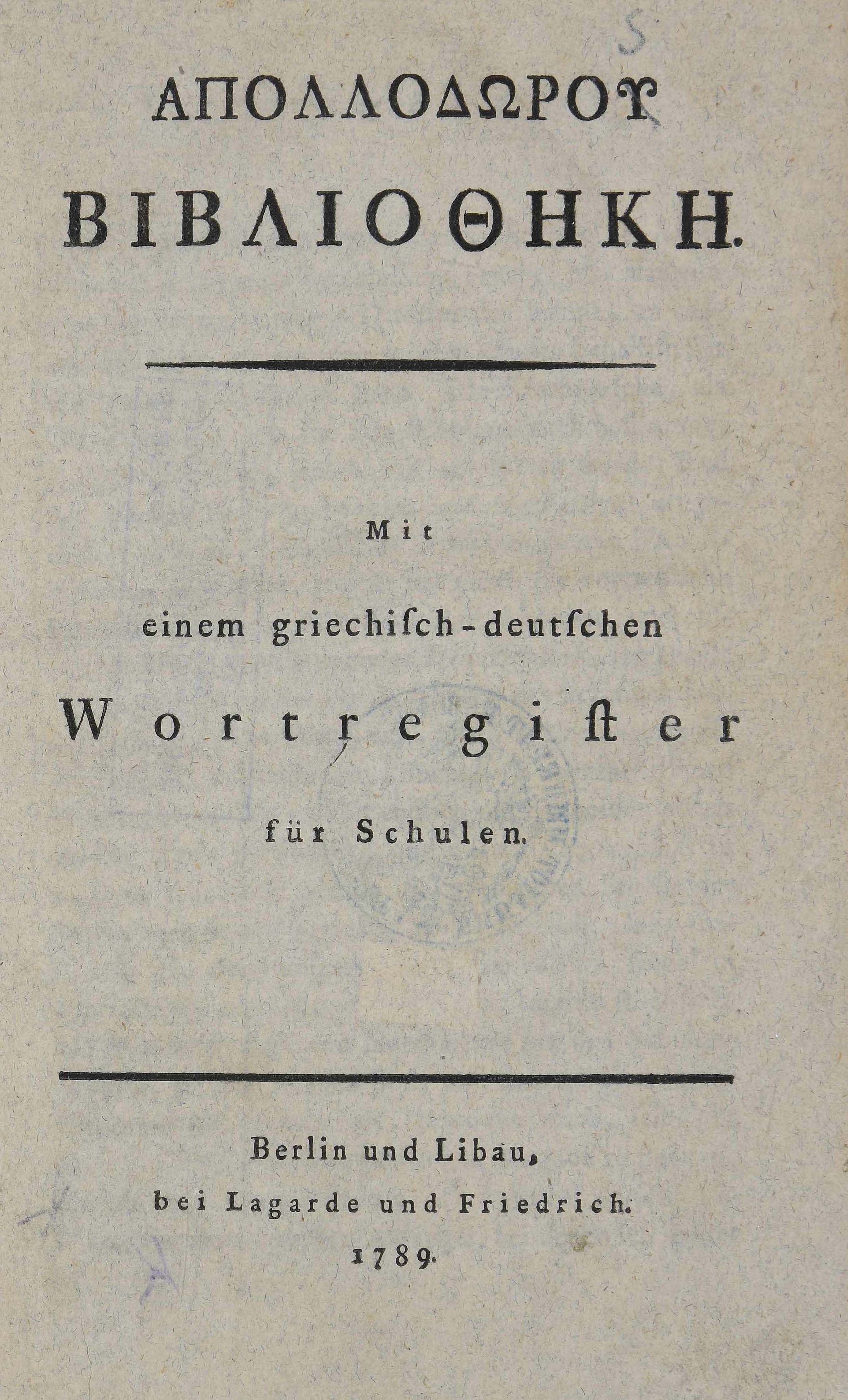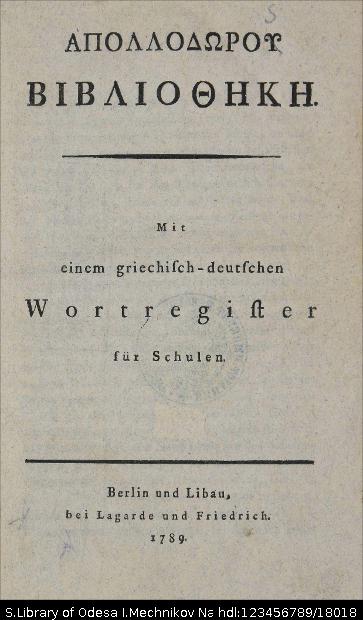 | Бібліографічний опис: | Απολλόδωρος ο Αθηναίος (Apollodorus Atheniensis ; 180 π. Χ. – περ. 110 π. Χ.). Απολλοδωρου βιβλιοθηκη : mit einem griechisch-deutschen Wortregister fur Schulen / [compil. Karl Heinrich Jördens]. – Berlin ; Libau [Liepāja] : bei Lagarde und Friedrich, 1789. – [4], 220 S. ; 8⁰ (19,5x11,5x1 cm). |