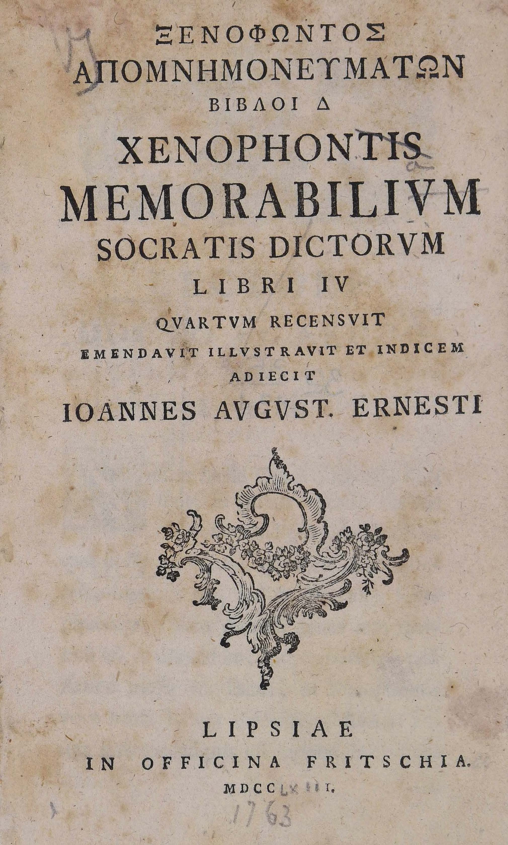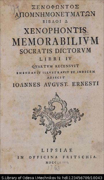 | Бібліографічний опис: | Ξενοφών (Xenophon ; 430 π. Χ. – 355 π. Χ.). Ξενοφωντοσ απομνημονευματων : βιβλια 4 = Xenophontis memorabilium Socratis dictorum : libri IV ... / recensuit emendavit illustravit et indicem adiecit Joannes August Ernesti. – Quartum ed. – Lipsiae [Leipzig] : in officina Fritschia, 1763. – [12], 220, [38] p. ; 8º (18x11,5x1,5 cm). |
