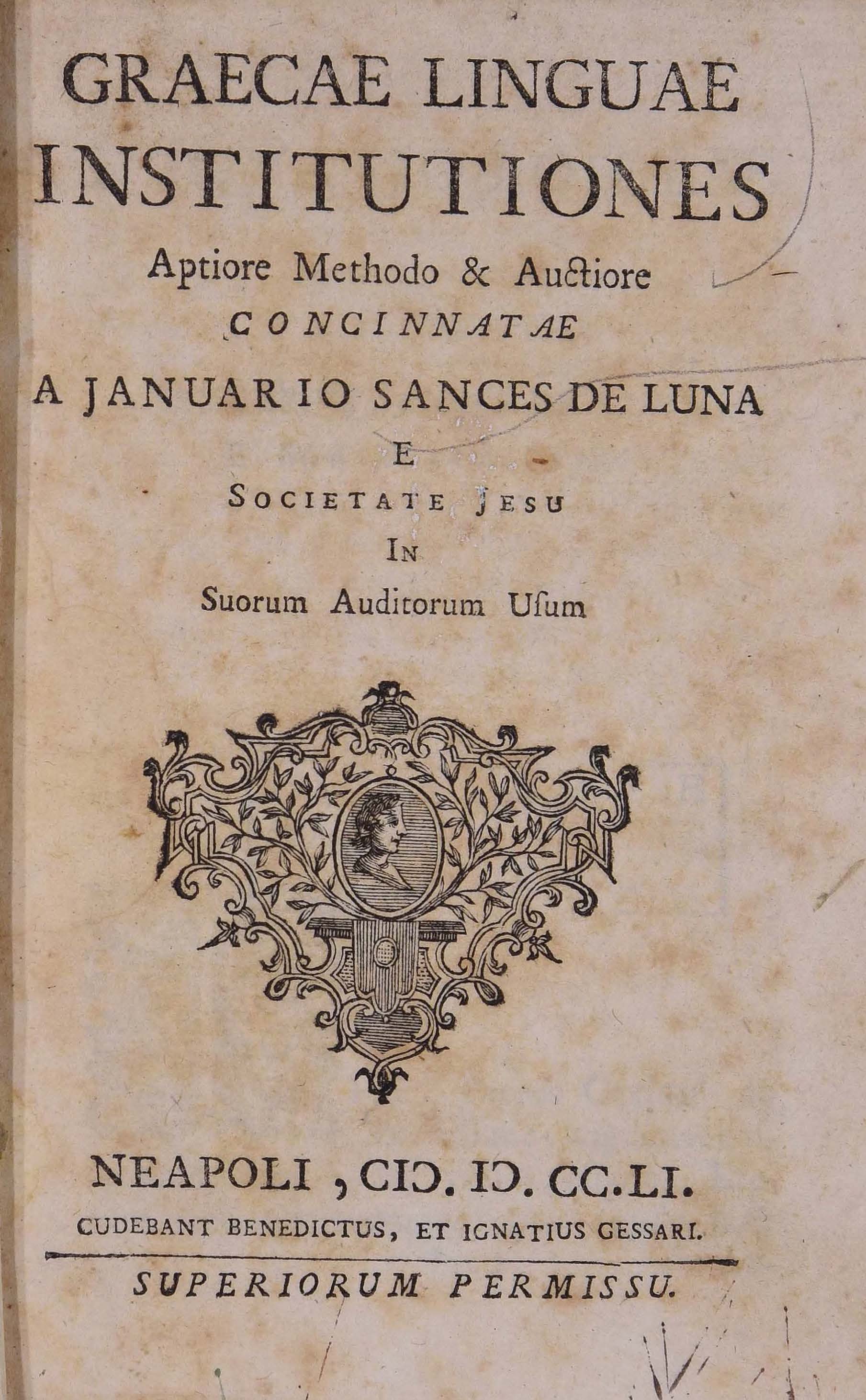 | Бібліографічний опис: | Sances de Luna, Januario (Sanchez de Luna, Gennaro). Graecae linguae institutiones / aptiore methodo et auctiore concinnatae a Januario Sances de Luna … in suorum auditorum usum. – Neapoli [Napoli] : Cudebant Benedictus, et Ignatius Gessari, 1751. – [16], 351, [1] p. ; 8° (16,5x11x1,8 cm). |