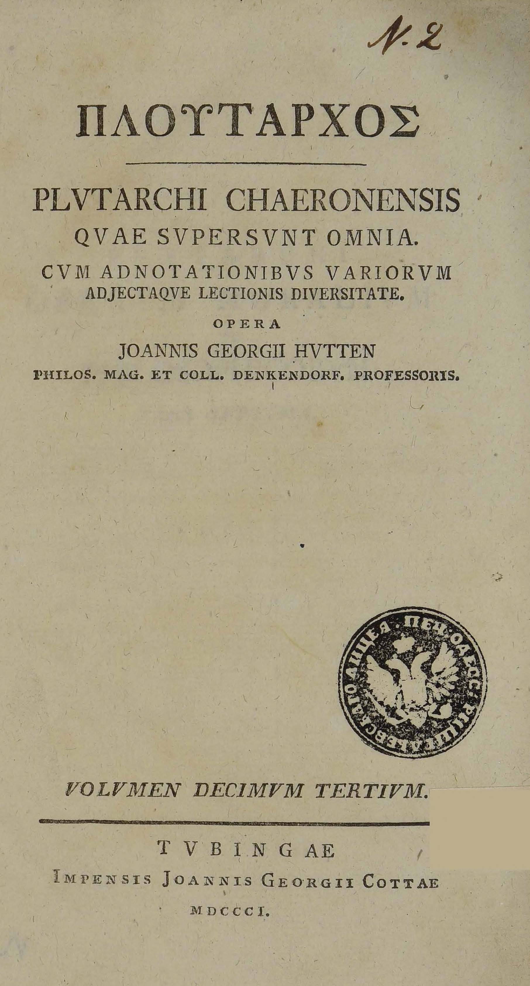 | Бібліографічний опис: | Πλουταρχος (Plutarchus ; περ. 46 – 120 μ. Χ.). Plutarchi Chaeronensis quae supersunt omnia : cum adnotationibus variorum adjectaque lectionis diversitate : [in 14 vol.] / opera Johannis Georgii Hutten ... – Tubingae [Tübingen] : imprensis Joannis Georgii Cottae, 1791–1804. Vol. 13. – 1801. – [2], VIII, 407, [1] p. ; 8⁰ (20,5x11,5x1,5 cm). |