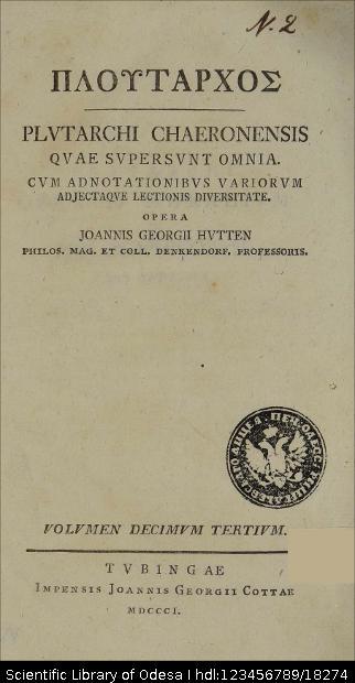 | Citation: | Πλουταρχος (Plutarchus ; περ. 46 – 120 μ. Χ.). Plutarchi Chaeronensis quae supersunt omnia : cum adnotationibus variorum adjectaque lectionis diversitate : [in 14 vol.] / opera Johannis Georgii Hutten ... – Tubingae [Tübingen] : imprensis Joannis Georgii Cottae, 1791–1804. Vol. 13. – 1801. – [2], VIII, 407, [1] p. ; 8⁰ (20,5x11,5x1,5 cm). |