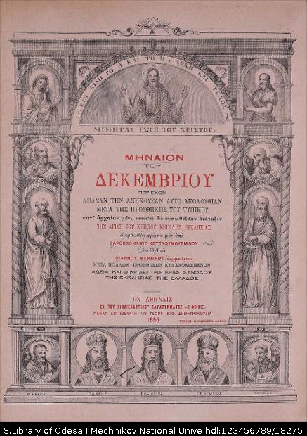 | dc.identifier.citation | Μηναιον του δεκεμβριου : περιέχον άπασαν την ανήκουσαν αυτώ Aκολουθίαν, μετά της προσθήκης του τυπικού ... / διορθωθέν πρωην μεν υπό Βαρθολομαίου Κουτλουμουσιανού νυν δε υπο Ιωαννου Μαρτινου … – Αθήνα : Εκ του βιβλιεκδοτικου καταστνματοσ «Ο Φοινιξ», 1896. – [2], 280 σ. | uk_UA |