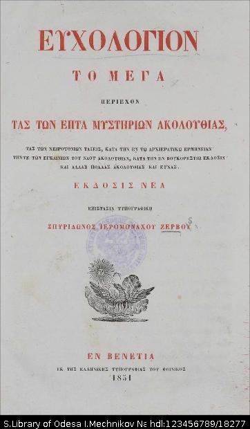 | dc.identifier.citation | Ευχολόγιον το Μεγα : περιέχον τας των επτά μυστηρίων ακολουθίας, τας των χειροτονιών τάξεις, κατά την εν τω αρχιερατικώ ερμηνείαν την τε των εγκαινίων του ναού ακολουθίαν, και την εν Βουκορεστίω έκδοσιν' και άλλας ποδδασ ακολουθίας και ευχάς / Εκδοσισ νεα επιστασια τυπογραικη Σπυρίδωνος Ιερομονάχου Ζερβού. – Βενετία [Venezia] : Εκ τησ Ελληνικησ τυπ. του Φοίνιξ, 1851. – 8, 685, [7] σ. | uk_UA |