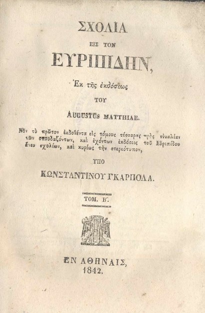 | Бібліографічний опис: | Σχόλια εις τον Ευριπίδην : εις τόμους τρεις / εκ της εκδόσεως του Augustus Matthiae ; νυν το πρώτον εκδοθέντα εις τόμους τρεις προς ευκολίαν των σπουδαζόντων και εχόντων εκδόσεις του Ευριπίδου άνευ σχολίων, και κυρίως την στερεότυπον, υπό Κωνσταντίνου Γκαρπολά. – Αθήνα : Τυπ. Κ. Γκαρπολά, 1842. - Τ. 2. – 1842. – 276 σ. |