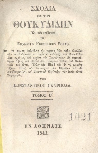 | Бібліографічний опис: | Poppo, Ernst Friedrich (1794-1866). Σχολια εις τον Θουκυδιδην : σε 2 τ. / εκ της εκδόσεως του Ernestus Fridericus Poppo ; νυν το πρώτον εκδοθέντα … προς ευκολίαν των σπουδαζόντων και εχόντων εκδόσεις του Θουκυδίδου άνευ σχολίων, και κυρίως την Στερεότυπον οις προσετέθησαν ο βίος του Θουκυδίδου, Γνωμικά Ηθικά και Πολιτικά του αυτού, Ελληνικός Πίναξ των εν τω κειμένω λέξεων, Πίναξ των Συμμάχων των Αθηναίων και των Λακεδαιμονίων, και Συνοπτική Περίληψις των οκτώ αυτού Ξυγγραφών, υπό Κωνσταντίνου Γκαρπολά. – Αφηνα : Τυπ. Κ. Γκαρπολά, 1841. Τ. 2. – 1841. – 315, [1] σ. |