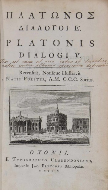 Бібліографічний опис: Πλάτων (Plato ; 427 π. Χ. – 347 π. Χ.). Πλατωνοσ Διαλογοι 5 = Platonis Dialogi V / recensuit, notisque illustravit Nath. Forester ... – Oxonii [Oxford] : e Typographeo Clarendoniano, imprensis Jac. Flatcher ... , 1745. – [8], 403, [19] p. ; 8⁰ (20x12x2 cm).