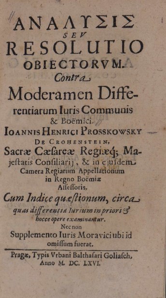 | Citation: | Αναλυσισ , seu Resolutio obiectorum : contra moderamen differentiarum juris communis et Boemici / Ioannnis Henrici Prosskowsky de Crohenstein … ; cum indice quastionum, circa quas differentiae iurium in priori et hocce opere examinantur, nec non supplemento iuris Moravici, ubi id ommissum fuerat. – Pragae [Praha] : Typis Urbani Balthasari Goliasch, 1666. – [16], 332, [2] p. ; 8⁰ (16x8,5x2 cm). |
