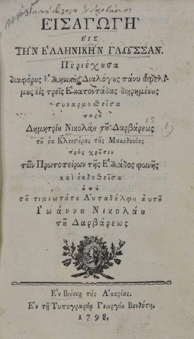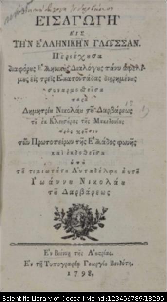 | Бібліографічний опис: | Εισαγωγή εις την Ελληνικήν γλώσσαν : περιέχουσα διαφόρους Ελληνικούς Διαλόγους πάνυ ωφελίμους, εις τρεις Εκατοντάδας διηρημένους' / συναρμολογηθείσα παρά Δημητρίου Νικολάου Δαρβάρεως … - Εν Βιέννη της Αουστρίας [Wien] : εν τη τυπογραφία Γεωργίου Βενδότη, 1798. – [16], 258, [6] σ.; 8⁰ (18x11x2,2 εκ.). |