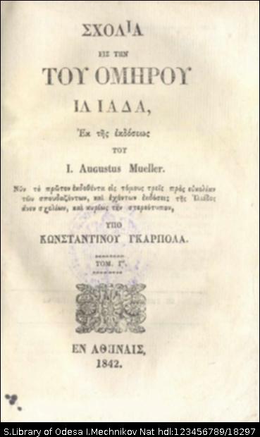 | Бібліографічний опис: | Müller, Johannes Augustus. Σχολια εις την του Ομνρου Ιλιαδα / εκ της εκδοσεως του Johannes Augustus Müller ; νυν το πρωτον εκδοθεντα εις τομους τρεις, προς ευκολιαν των σπουδαζοντων, και εχοντων εκδοσεις της Ιλιαδος ανευ σχολιων, και κυριως την στερεοτυπον, υπο Κωνσταντινου Γκαρπολα. – Αθηνα : Τυπ. Κ. Γκαρπολά, 1841-1842. - Τ. 3. – 1842. – 386, [2] σ. |