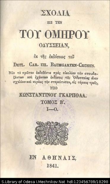 | Бібліографічний опис: | Baumgarten-Crusius, Detlev Karl Wilhelm (1788-1843). Σχόλια εις την του Ομήρου Οδύσσειαν : [σε 3 τ.] / εκ της εκδόσεως του Detl. Car. Guil. Baumgarten-Crusius ; νυν το πρώτον εκδοθέντα προς ευκολίαν των σπουδαζόντων και εχόντων εκδόσεις της Οδυσσείας άνευ σχολίων, και κυρίως την στερεότυπον, υπό Κωνσταντίνου Γκαρπολά. – Αθηνα : Τυπ. Κ. Γκαρπολά, 1841. Τ. 2 : Ι-Ο. – 1841. – [2], 288 σ. |