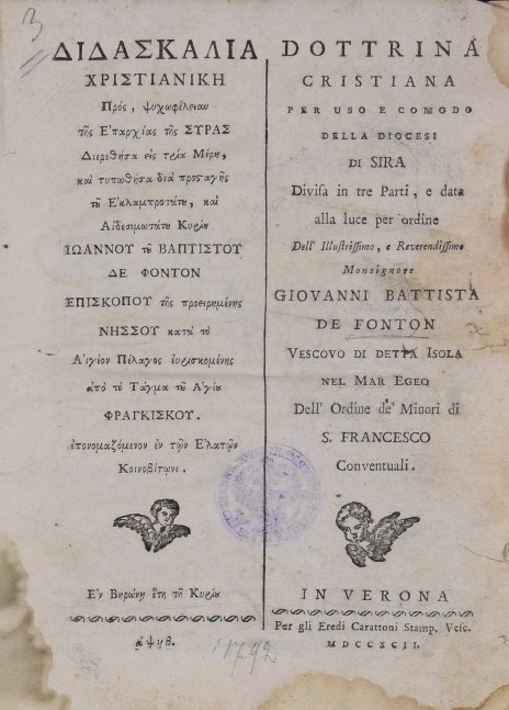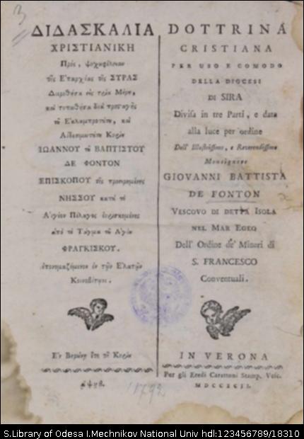 | Бібліографічний опис: | Διδασκαλία Χριστιανική προς ψυχωφέλειαν της επαρχίας της Σύρας : διαιρεθ{ή}σα εις τρία μέρη, και τυπωθ{ή}σα δια προσταγής του Εκλαμπροτάτου και Αιδεσιμωτάτου κυρίου Ι{ο}άννου Βαπτιστού δε Φοντόν … = Dottrina Cristiana per uso e comodo della Diocesi di Sira : divisa in tre parti. e data alla luce per ordine dell'illustrissimo, e reverendissimo monsignore Giovanni Battista De Fonton / Diocesi di Sira. – In Verona : per gli Eredi Carattoni Stamp. Vesc., 1792. – 155, [1] p. ; 4⁰ (2417,5x0,8 cm). |